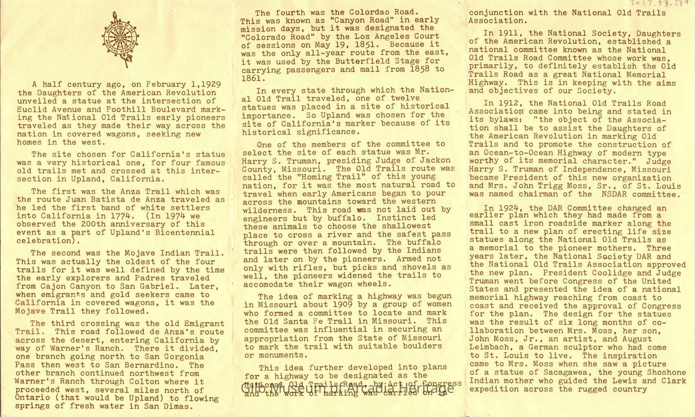 The Madonna of The Trail Monument Golden Anniversity PamphletEntry/Object ID