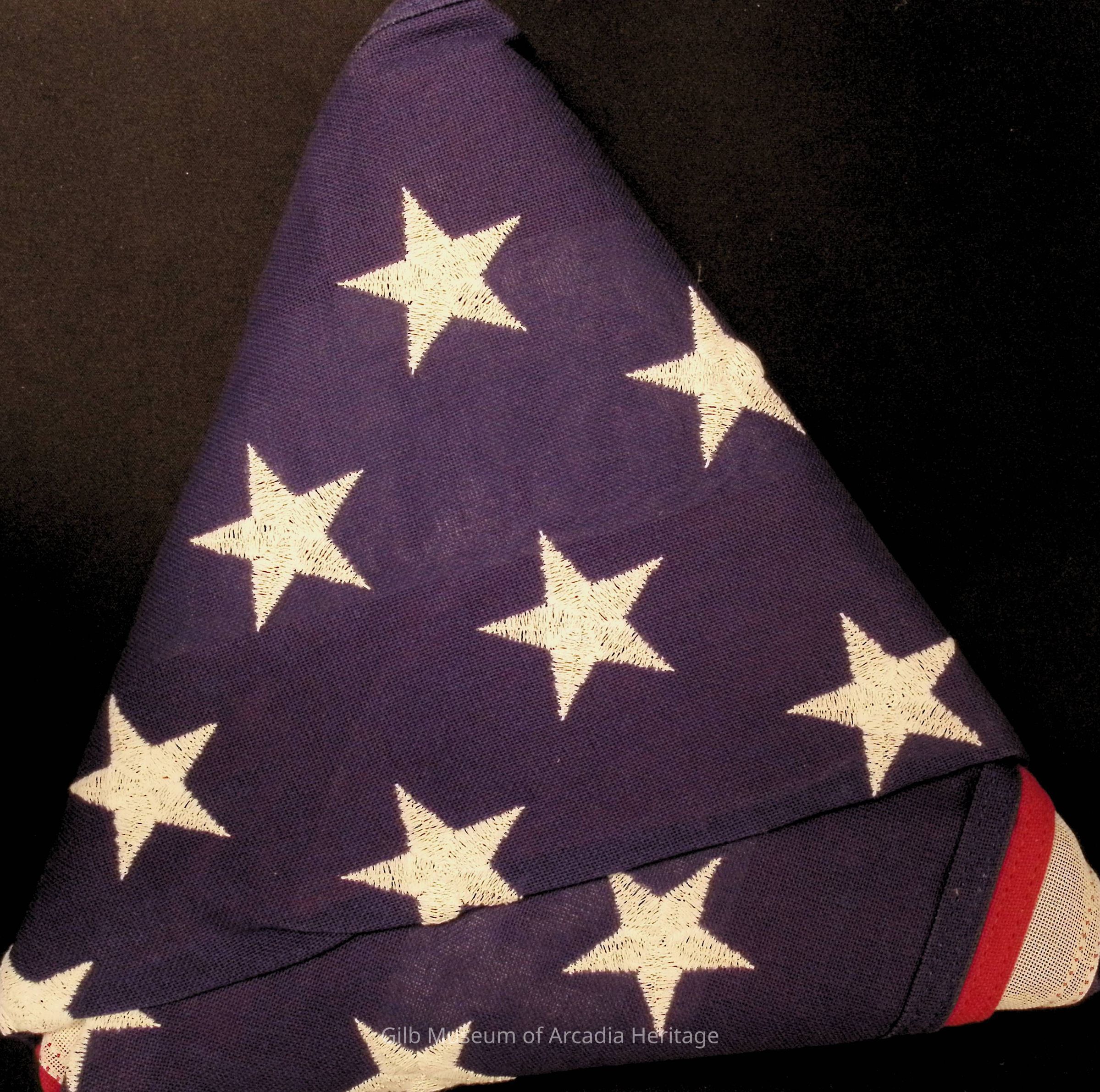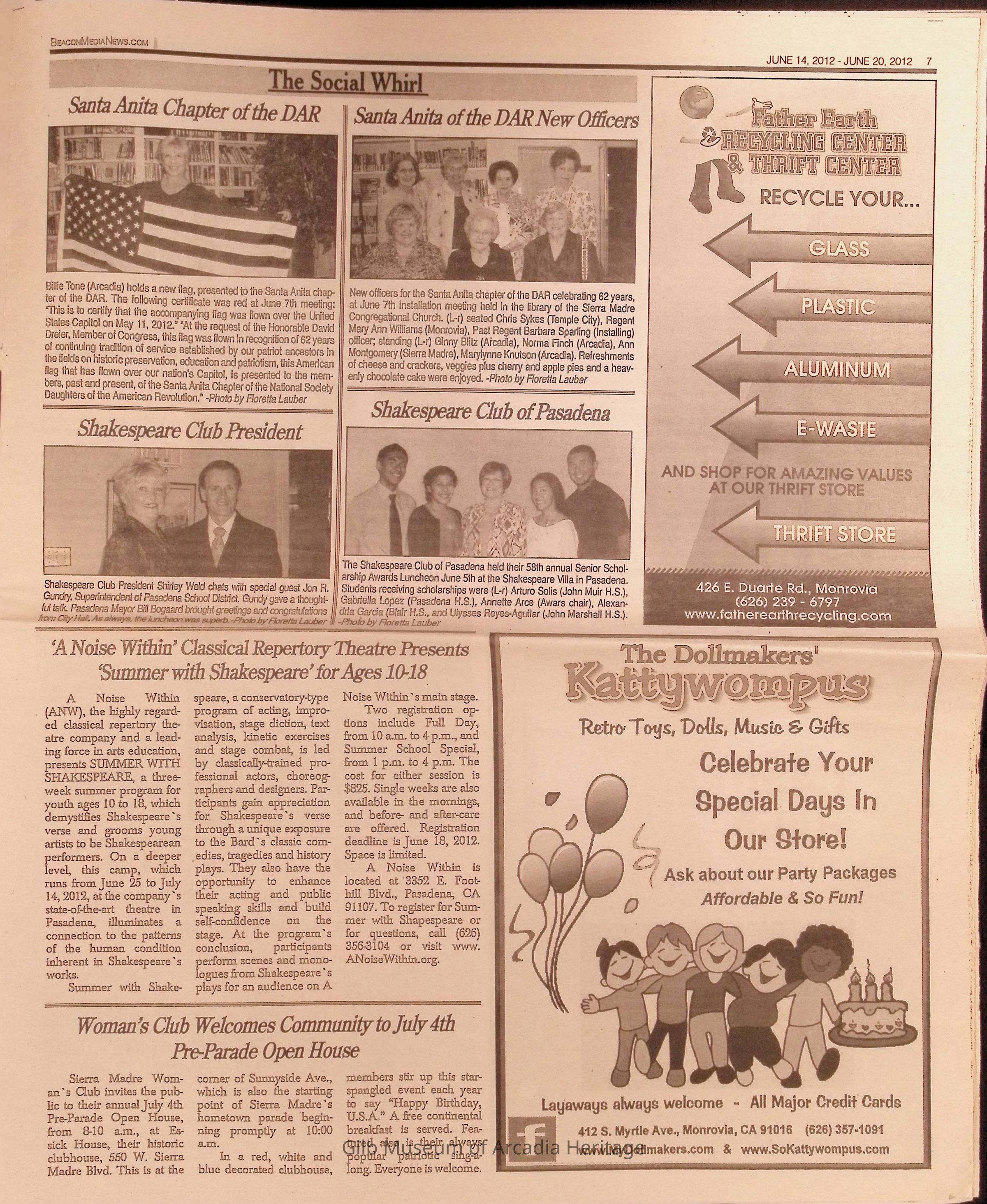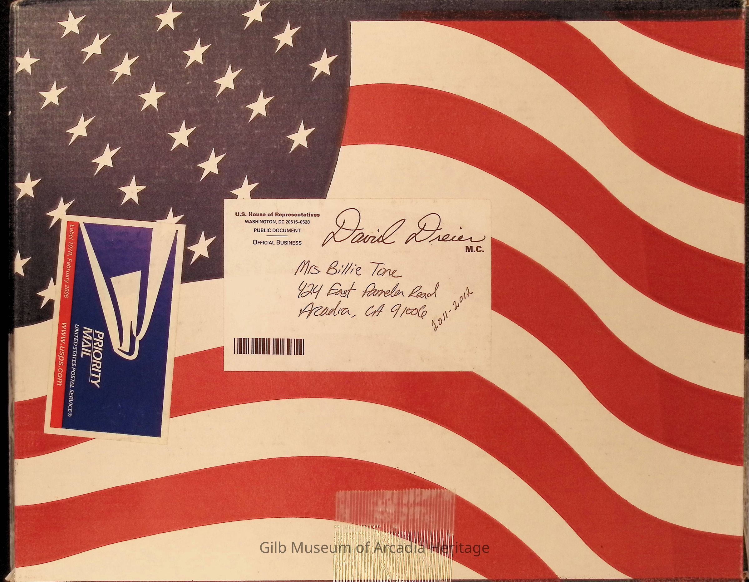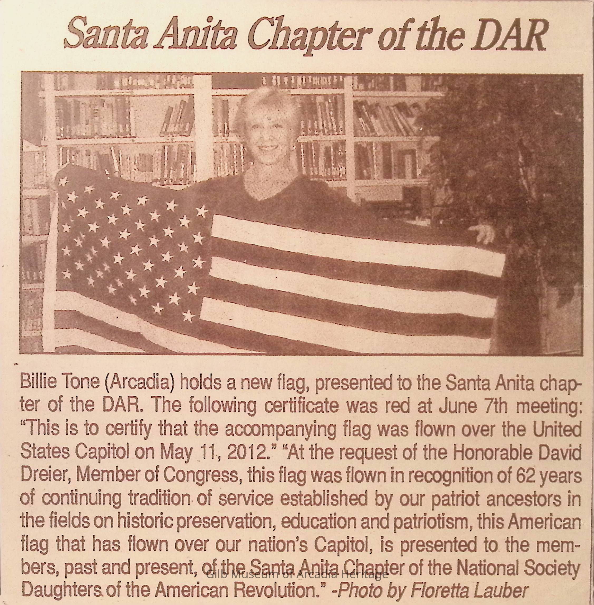 There is an United State Flag, which was flown over the United States Congress on May 12, 2012. It was presented to the Santa Anita Chapter. There is a newspaper about the presentation and a photo of Billie Tone holding the Flag. There is board with the same image as the newspaper.