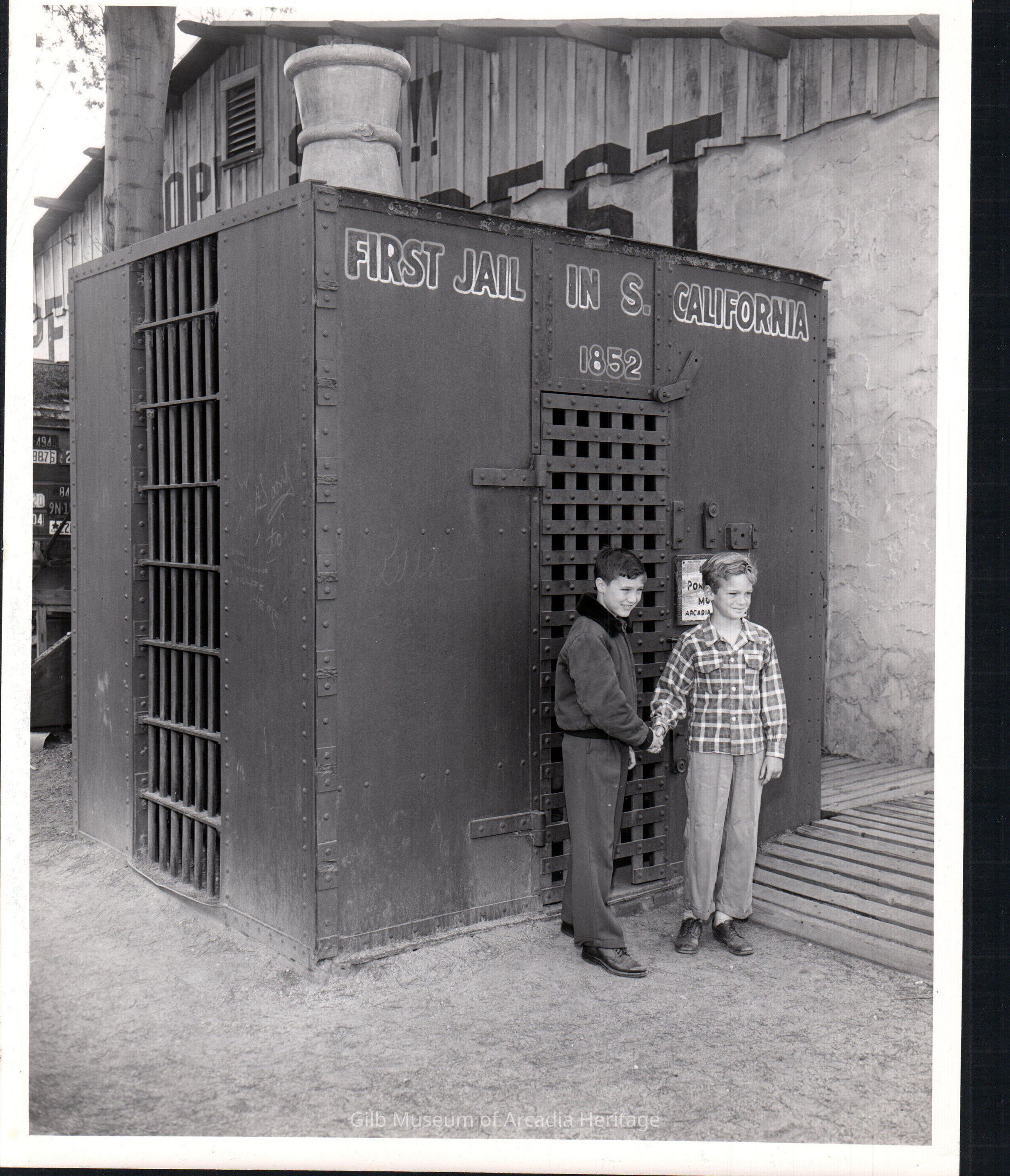 Two young boys taking a picture in front of the jail exhibit at the Pony Express Museum in Arcadia, CA.Collection