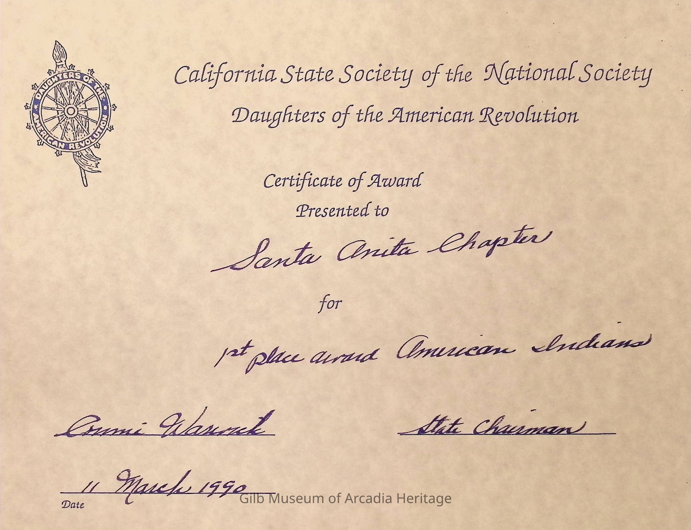 CSS DAR Award for American Indians, March 1990. It was a first place award.Collection