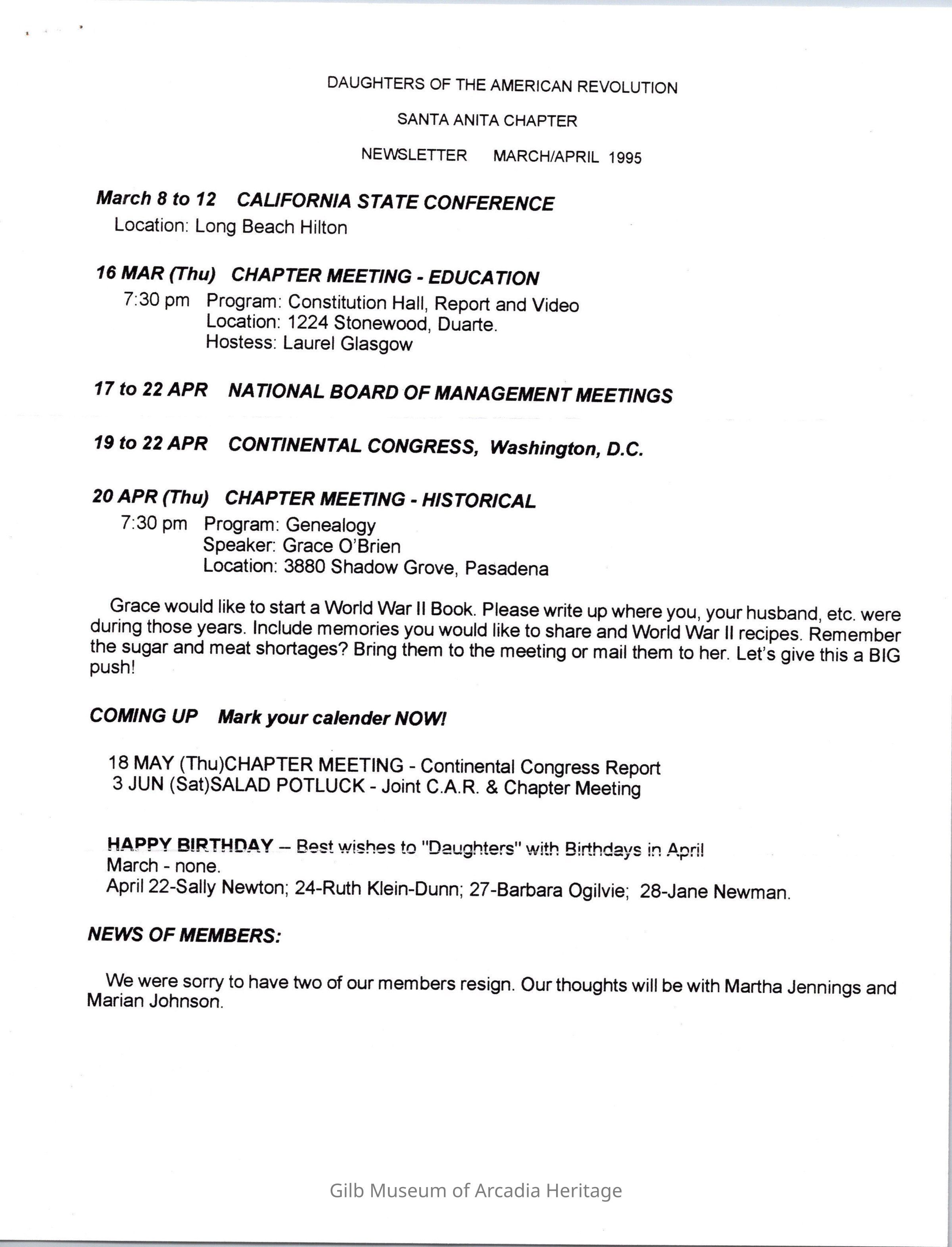 DAR: Santa Anita Chapter NSDAR March/April 1995 NewsletterCollection