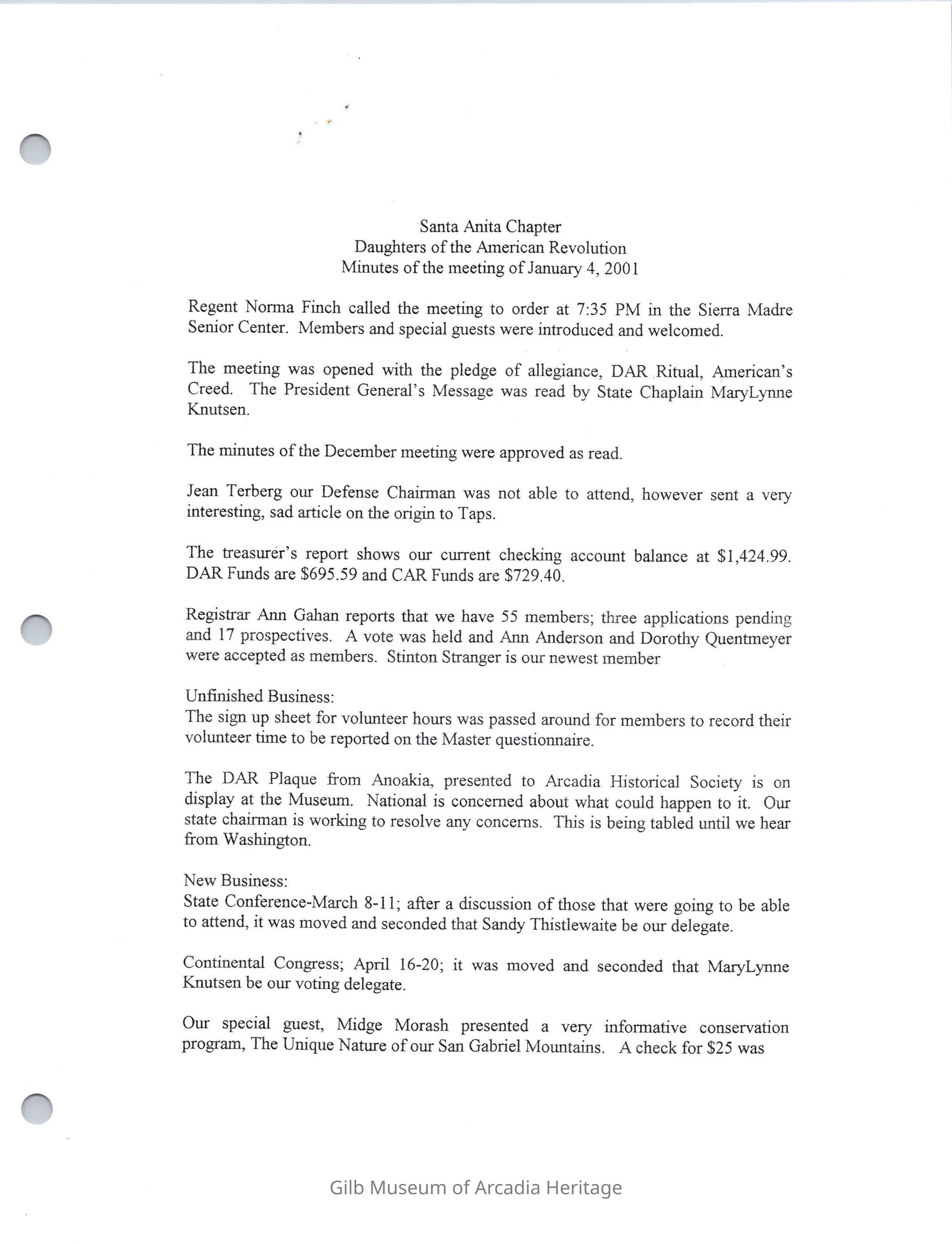 Santa Anita Chapter, DAR Board Meeting Jan. 4, 2001Entry/Object ID