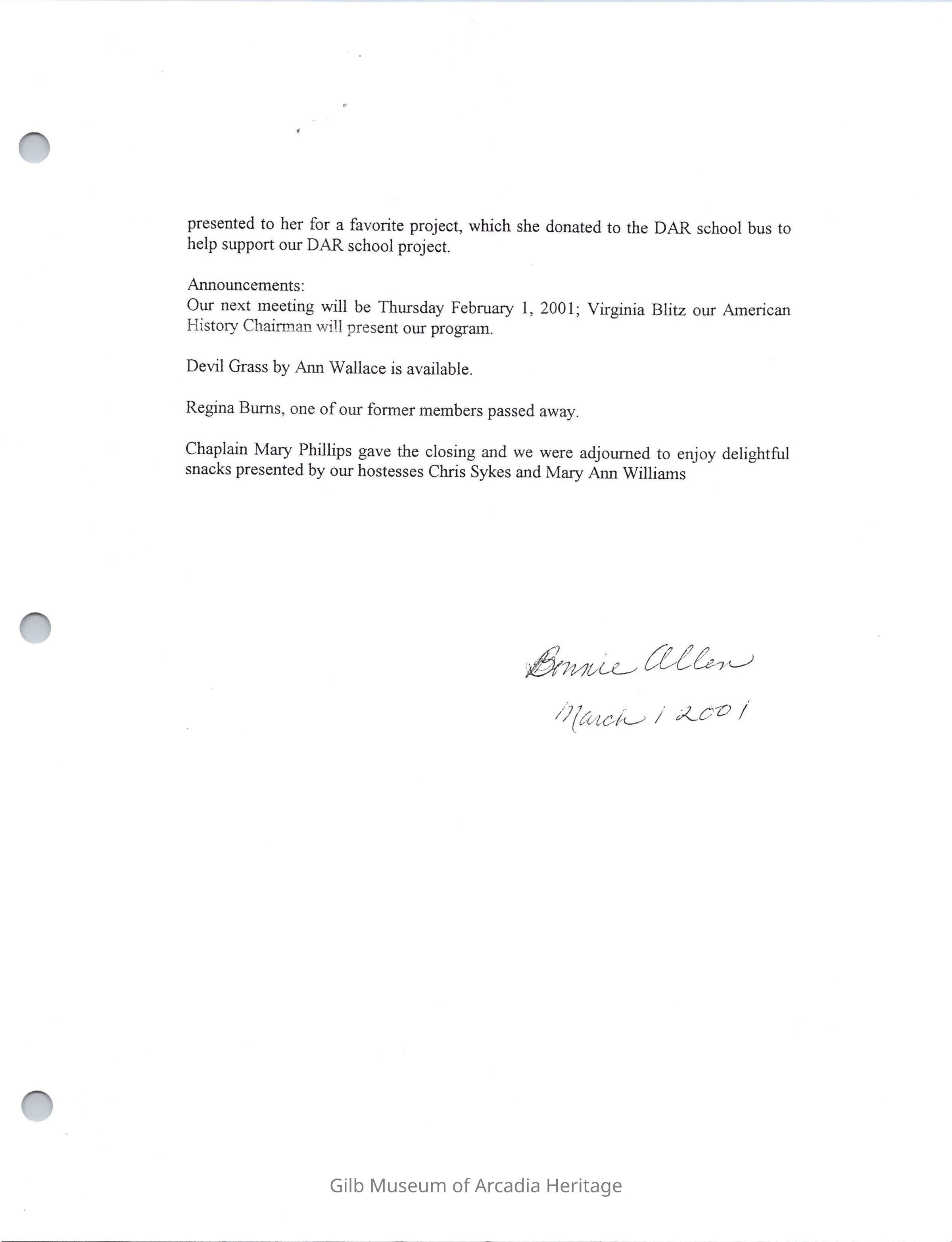 Santa Anita Chapter, DAR Board Meeting Jan. 4, 2001.Collection