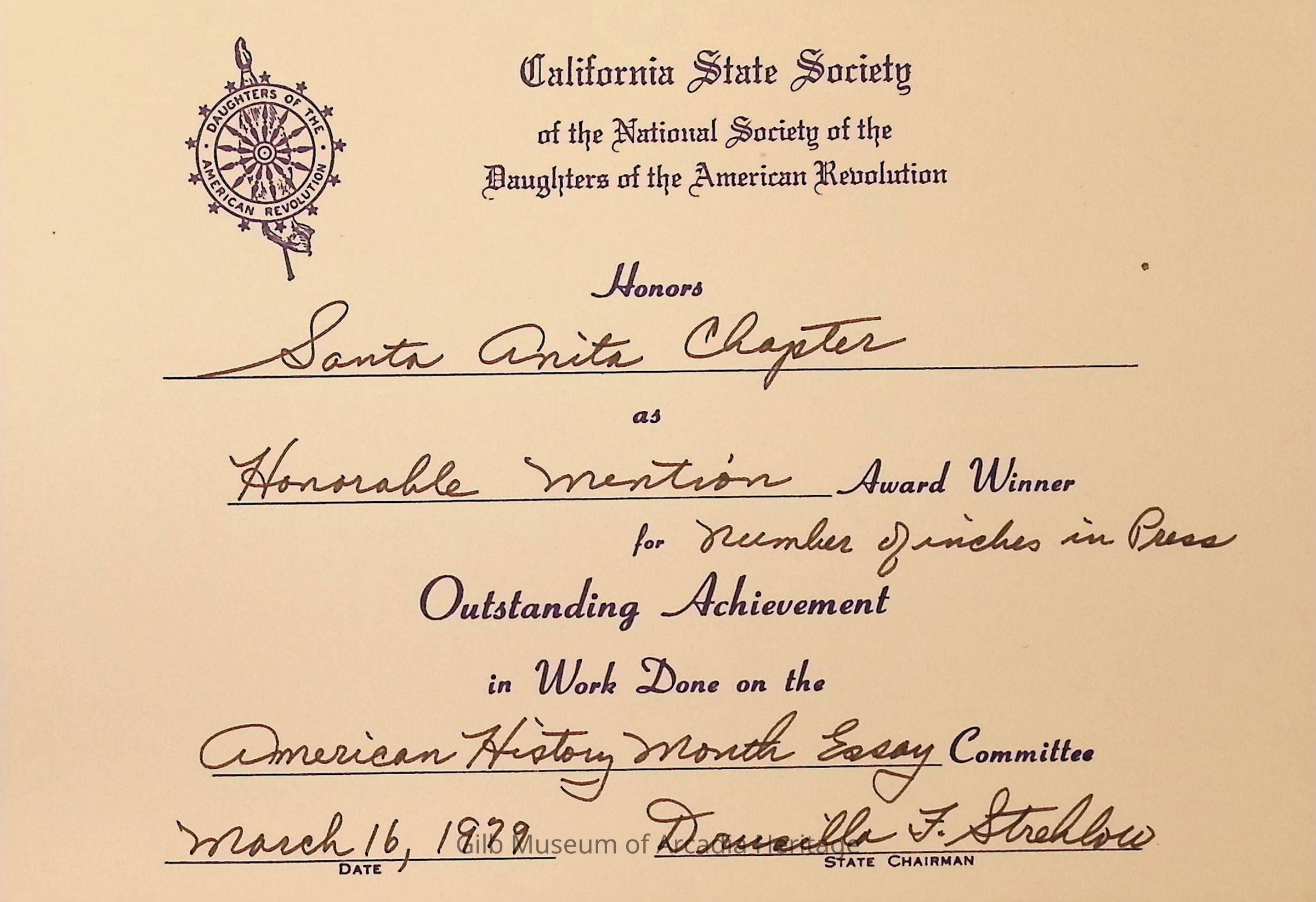 Daughters of American Revolution Santa Anita ChapterScope and Content