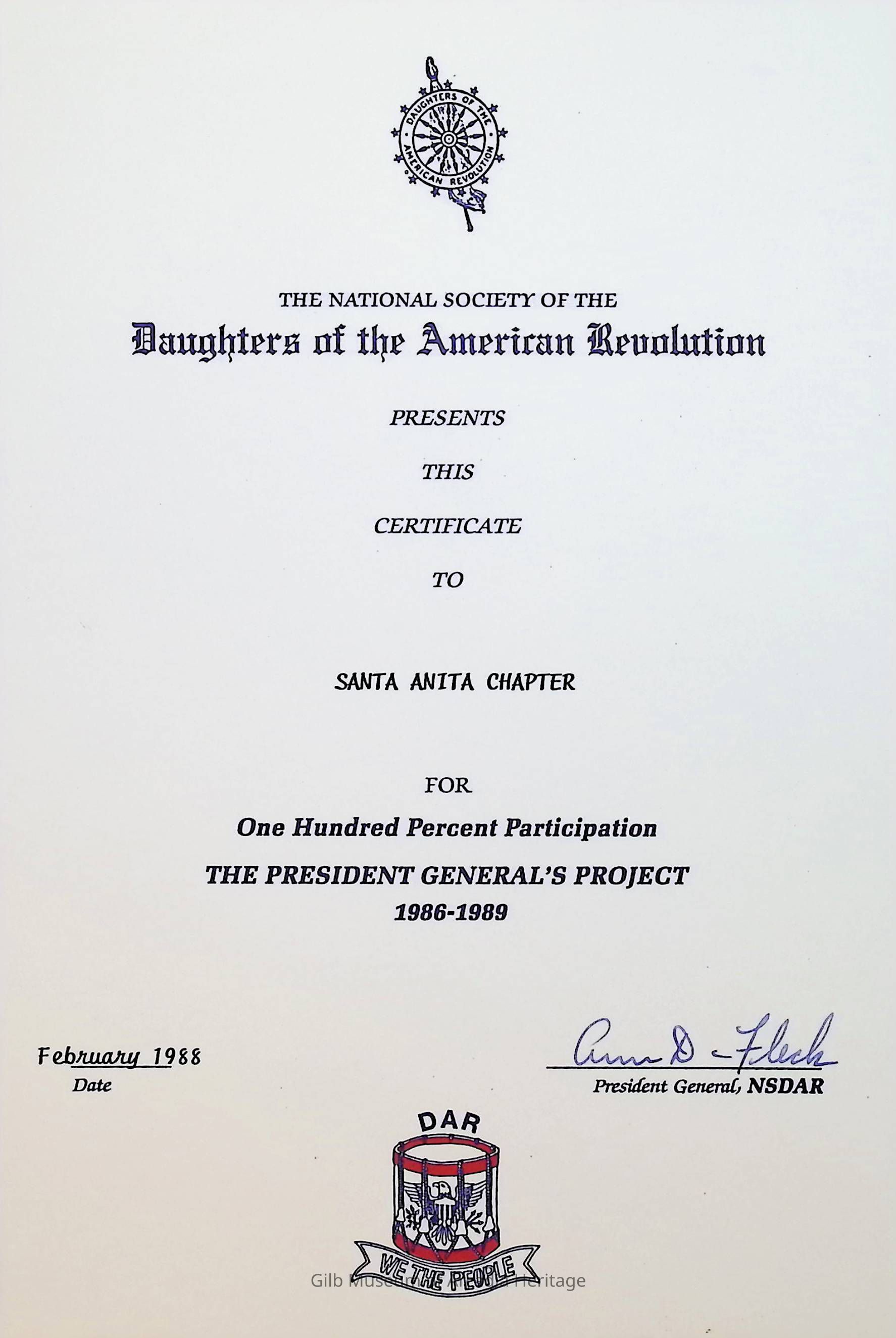 Daughters of the American Revolution Chapter Santa Anita Award for "One Hundred Percent Participation" on the project The President General's Project, 1986-1989.
