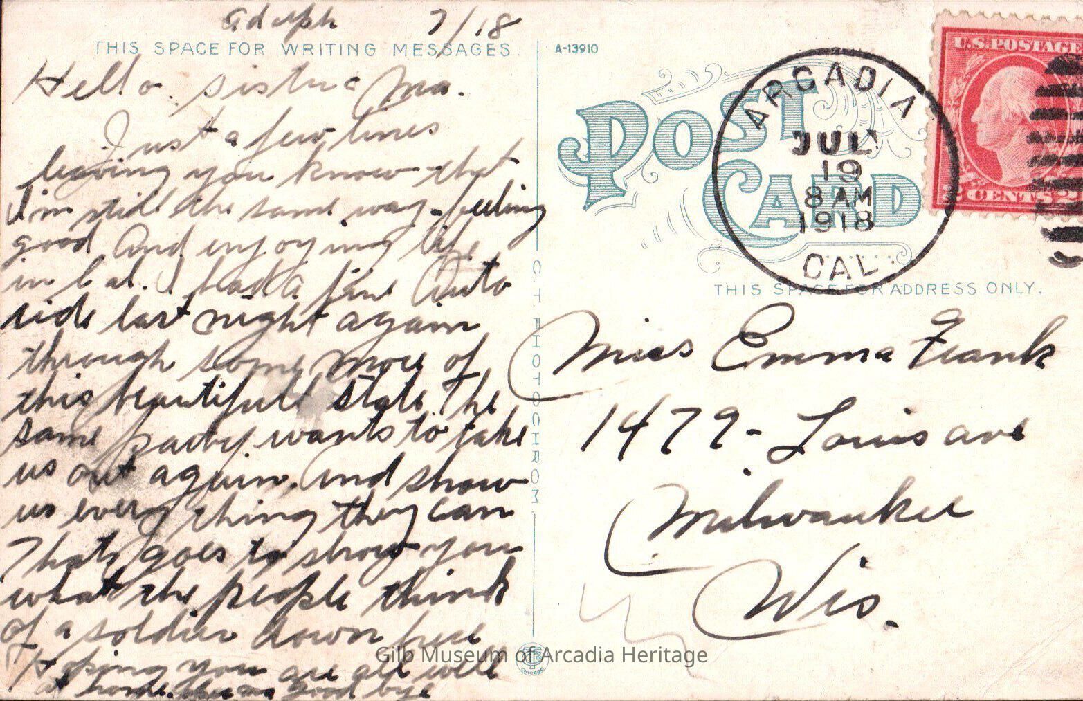 Hello sister & Ma Just a few lines letting you know that I’m still the same way- feeling good and enjoying life in Cal[ifornia]. I had a fine auto[mobile] ride last night again through some more of the beautiful sights. The same party wants to take us out again and show us everything they can. That goes to show you what the people think wf a soldier down here. Hoping you are all well at home, Ma. Good bye.