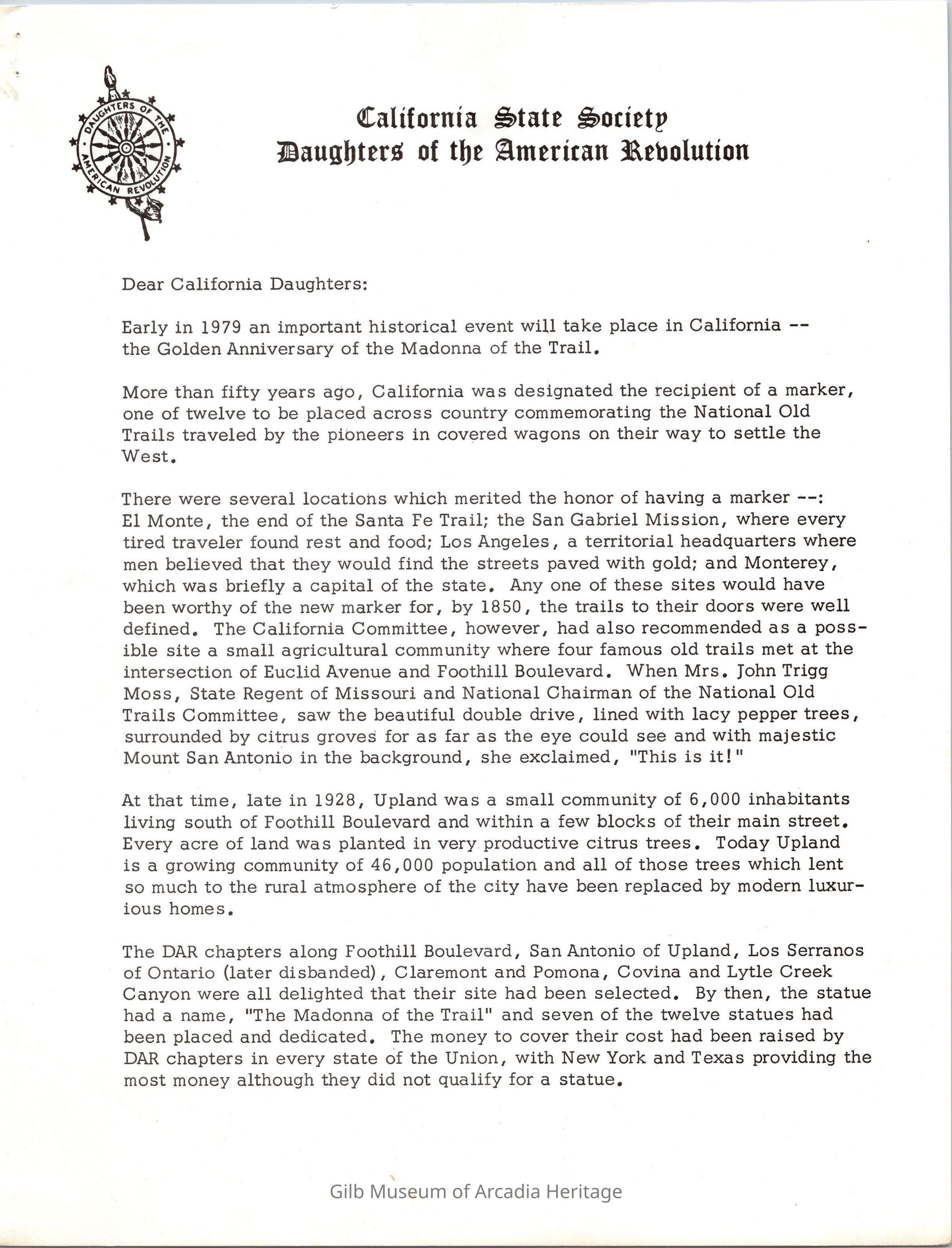 CSS DAR Newsletter about The Madonna of The Trail MonumentEntry/Object ID