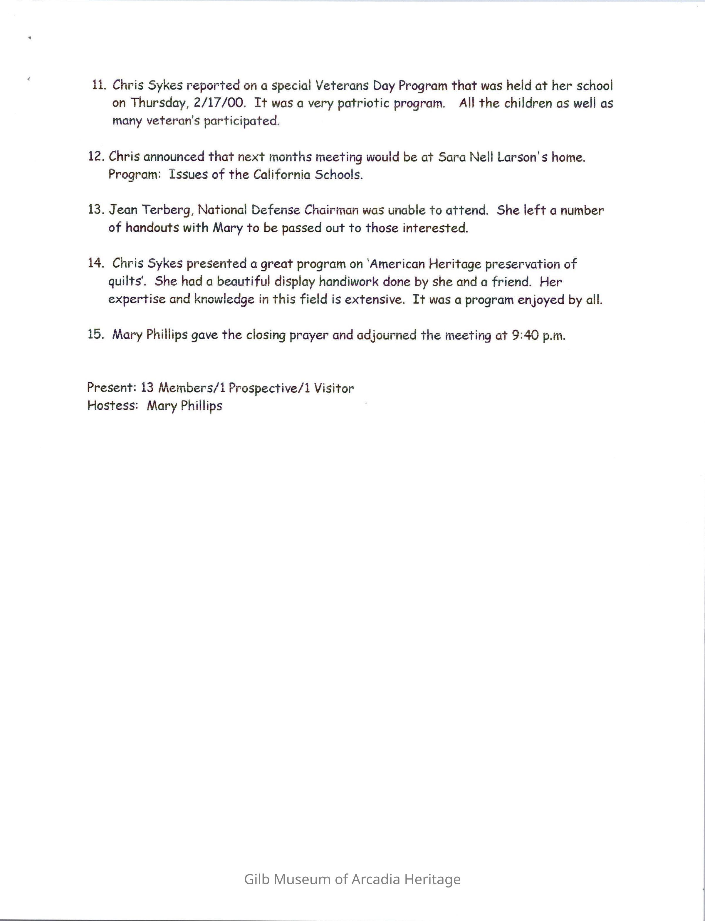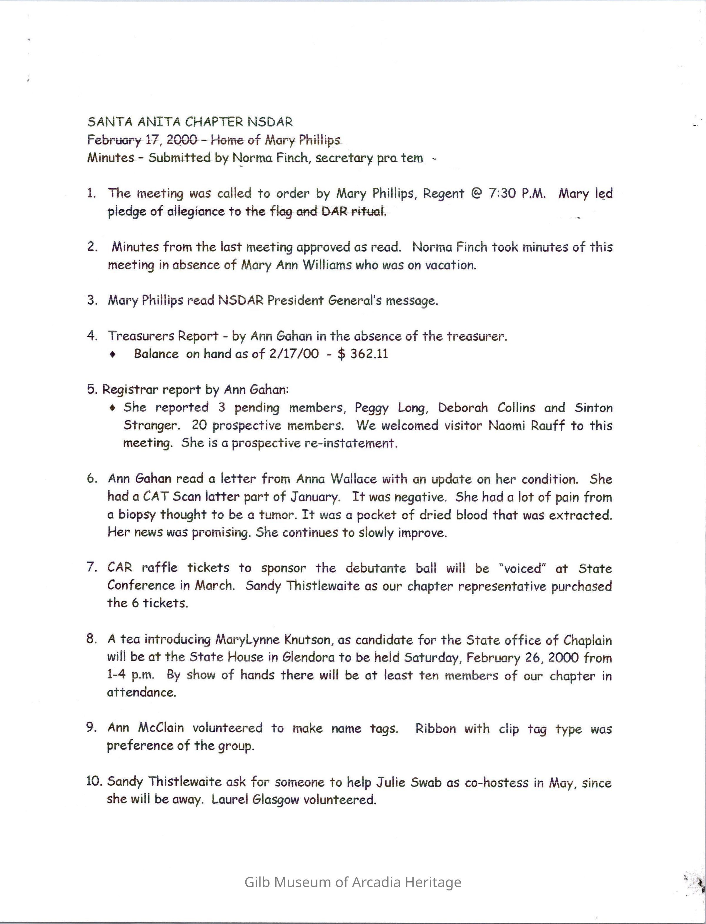 Santa Anita Chapter NSDAR Minutes Feb. 17, 2000 submitted by Norma Finch. The meeting was at Mary Phillips home.Collection