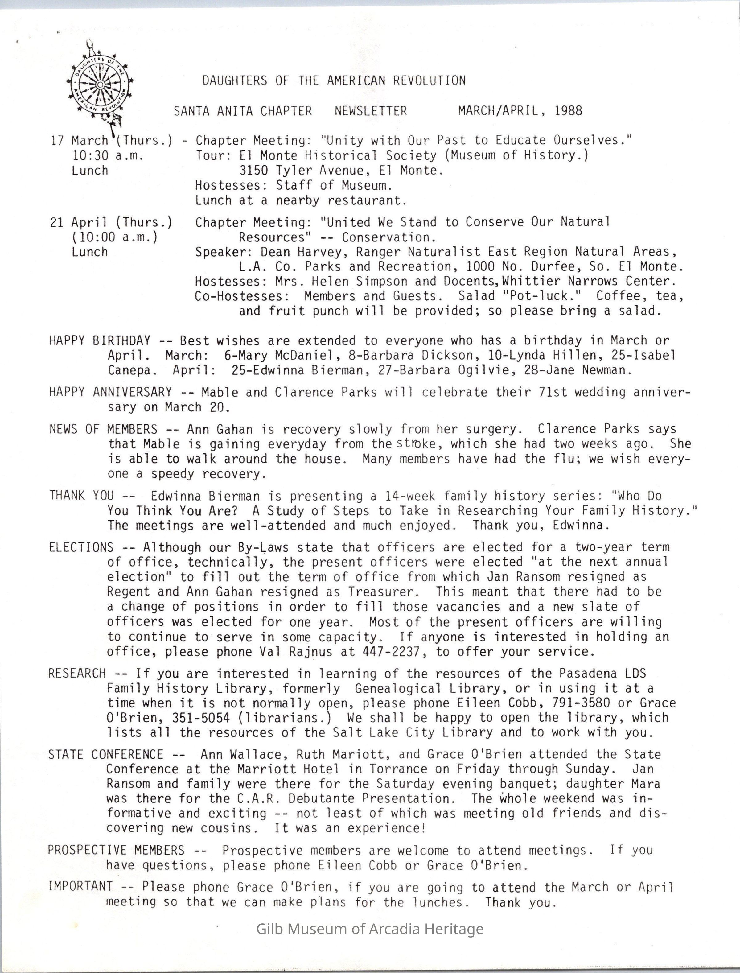 DAR: Santa Anita Chapter NSDAR March/April 1988 Newsletter