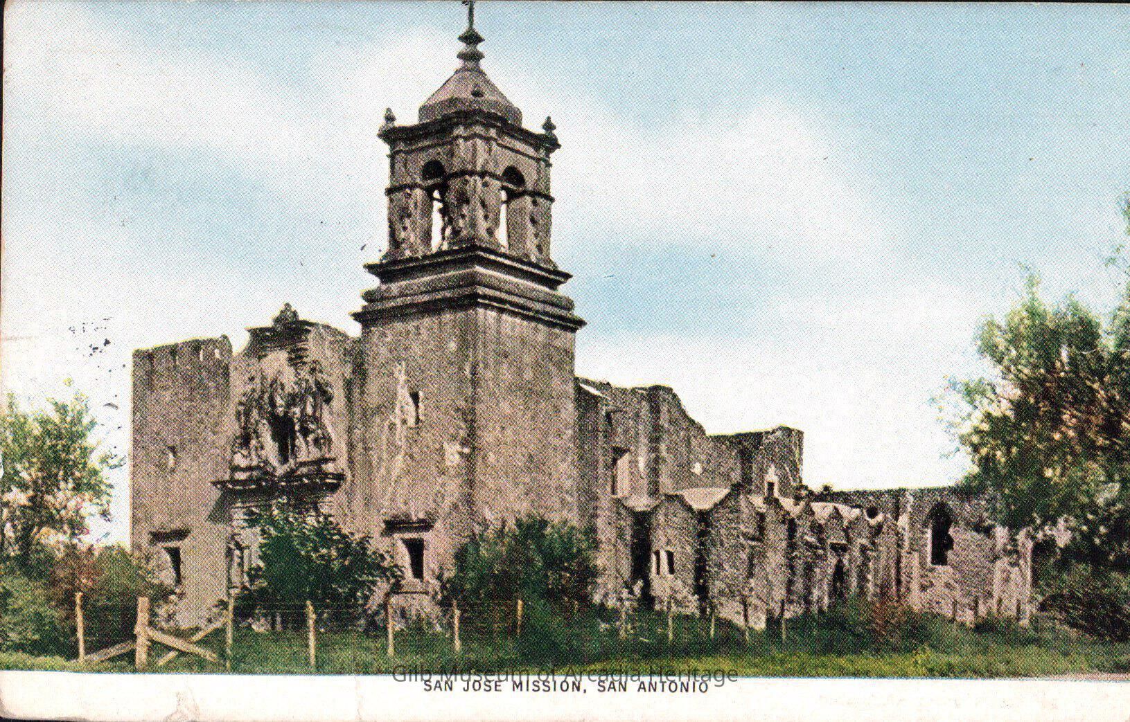 Front of postcard: The remaining stone walls and tower of the San Jose Mission in San Antonio, Texas.Collection