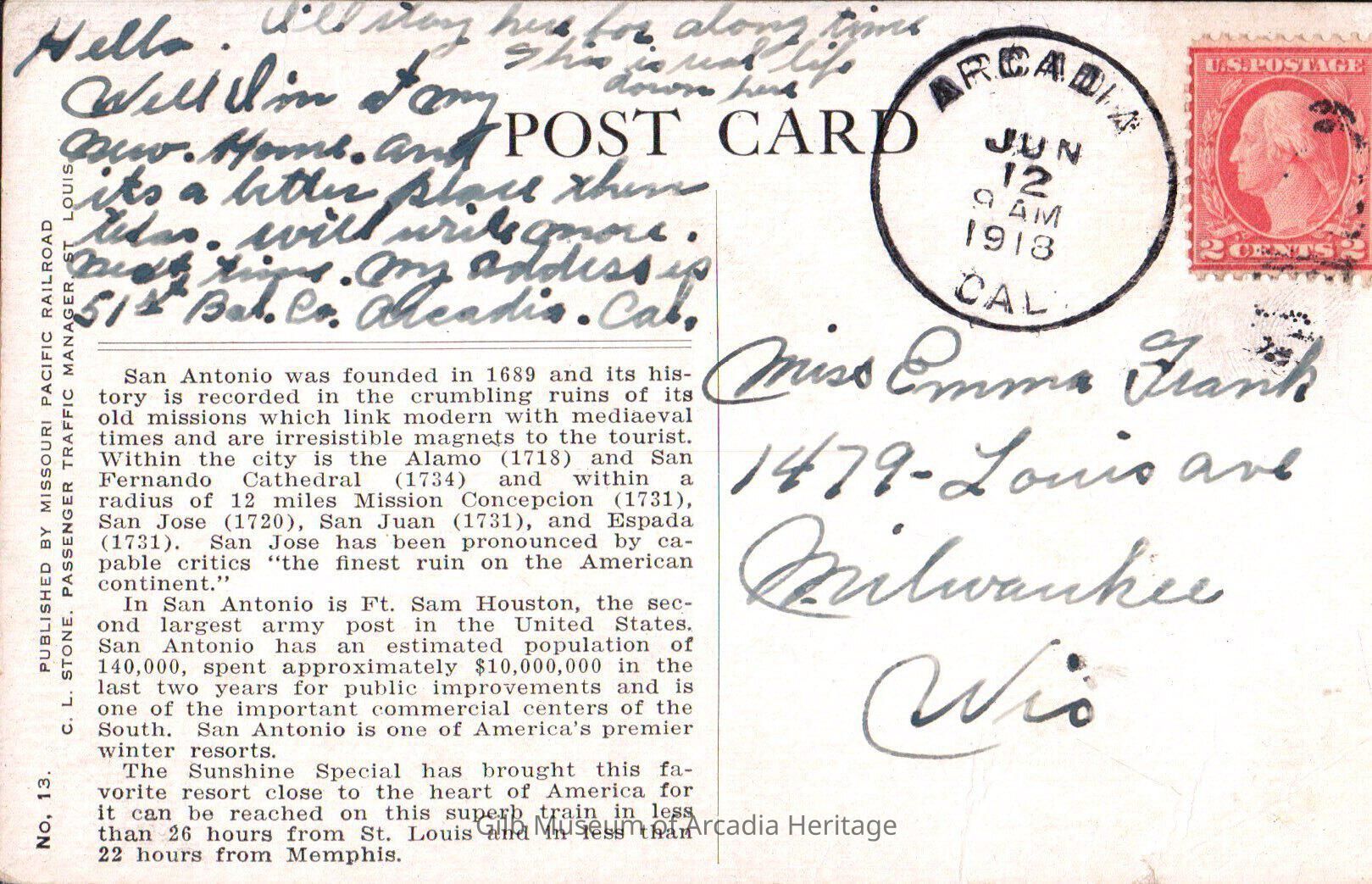 Hello. I'll stay here for along time. This is my life down here. Well I'm at my new home. And its a little place this time. Will write more. [illegible] troops. My address is 51st Bal. Co. Arcadia. Cal.