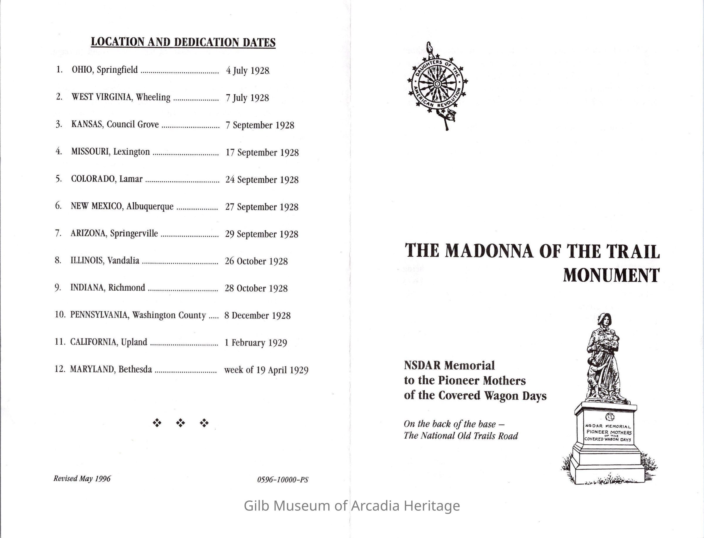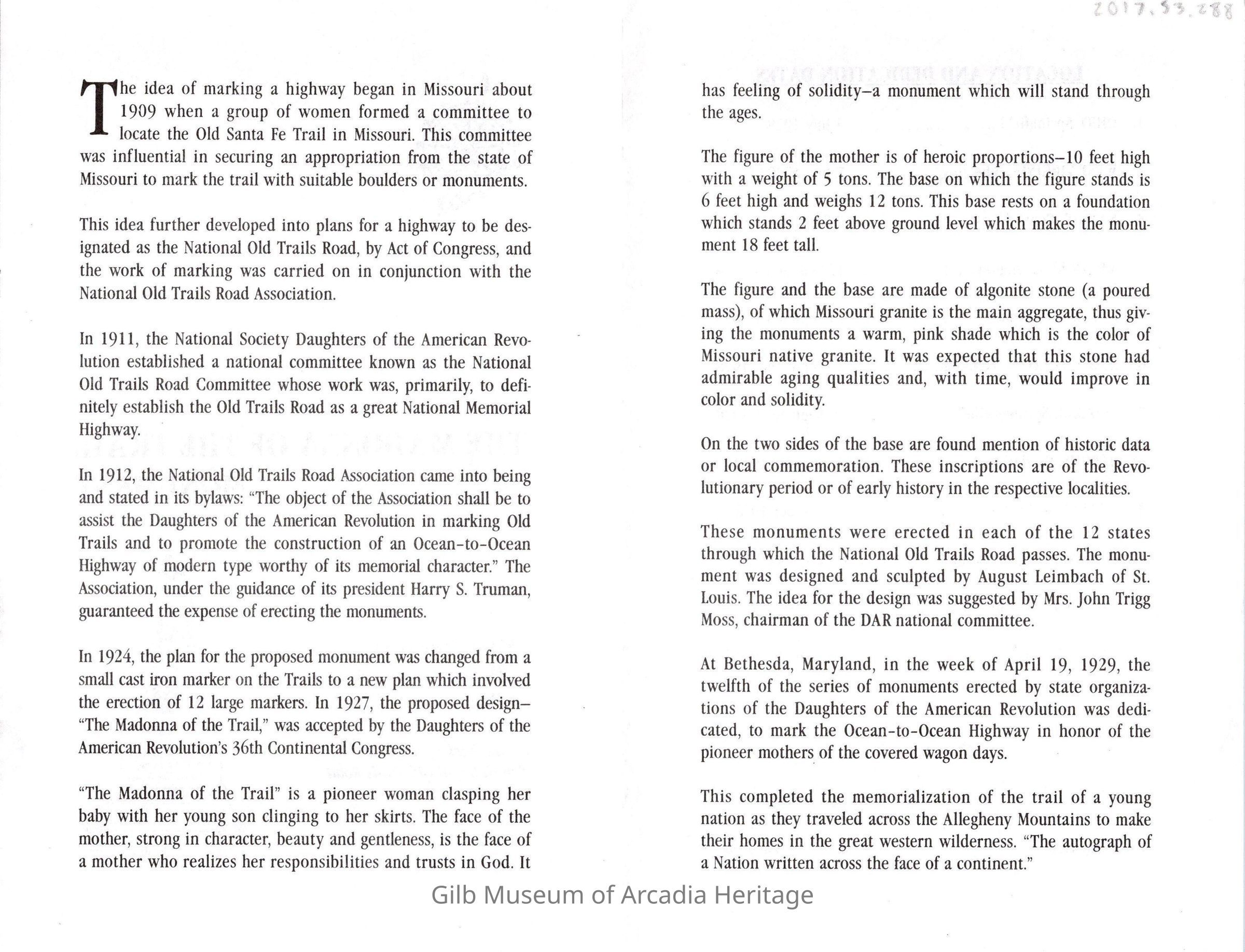 The Madonna of The Trail Monument PamphletEntry/Object ID