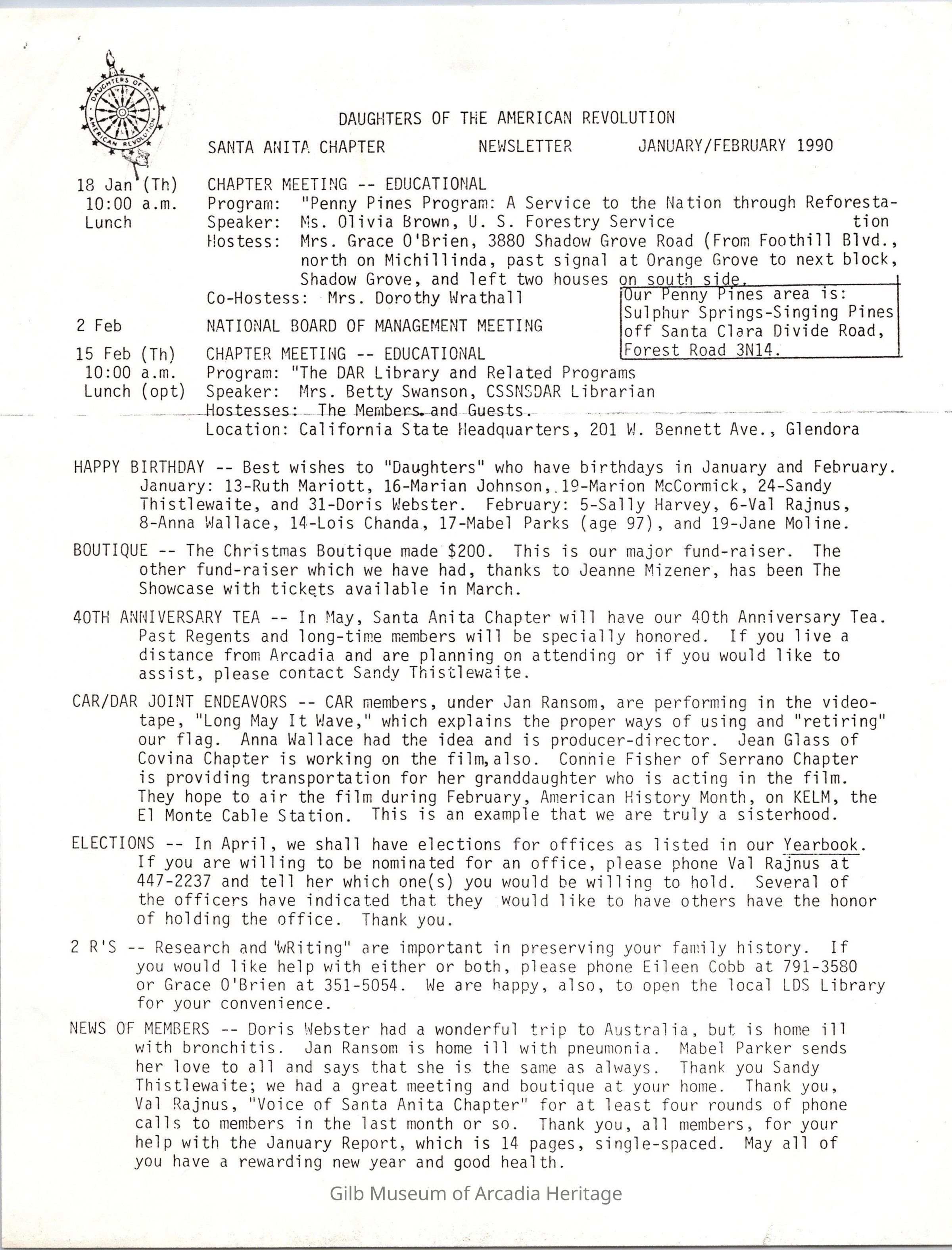 DAR: Santa Anita Chapter NSDAR January/February 1990 NewsletterEntry/Object ID
