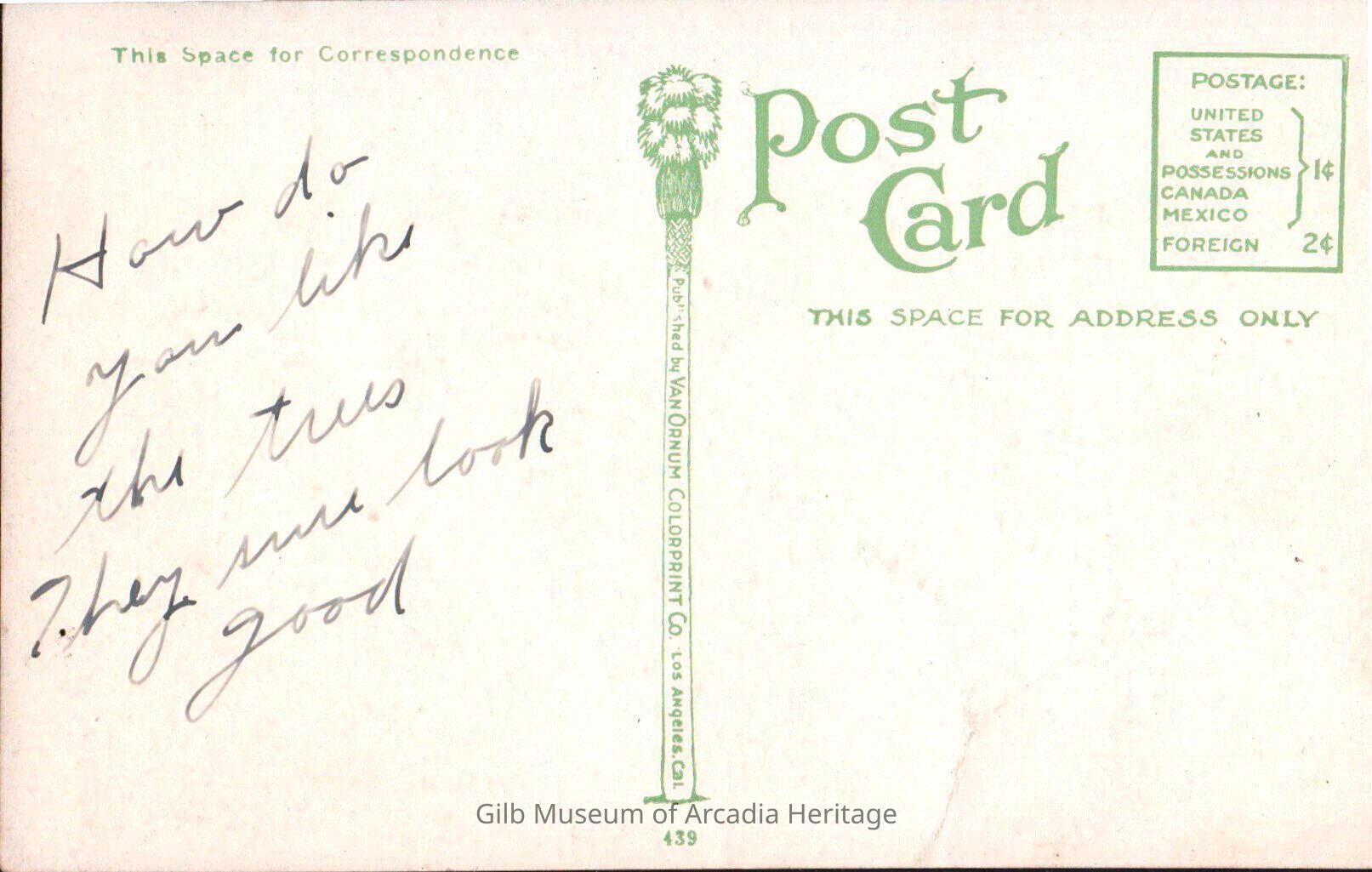 Front of postcard: Two men stand on ladders in an orange grove, picking oranges. Three other men work from ground level. Two women are visible in the background. A snow covered mountain is on the horizon.Collection