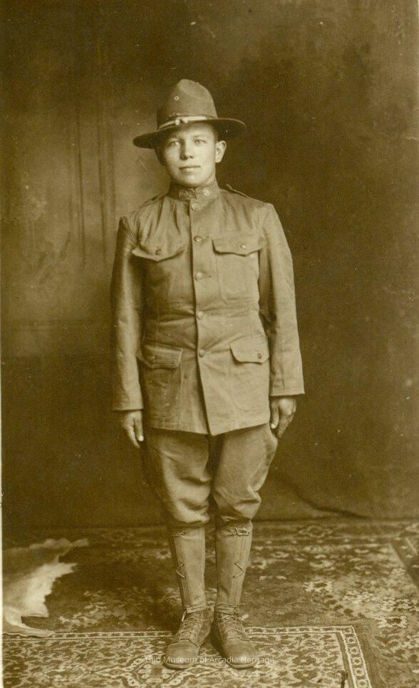 Black and white photograph of Cadet Adolph Frank in 1918. He is standing at attention, in uniform, and with his Army cover (hat) and leggings.Collection