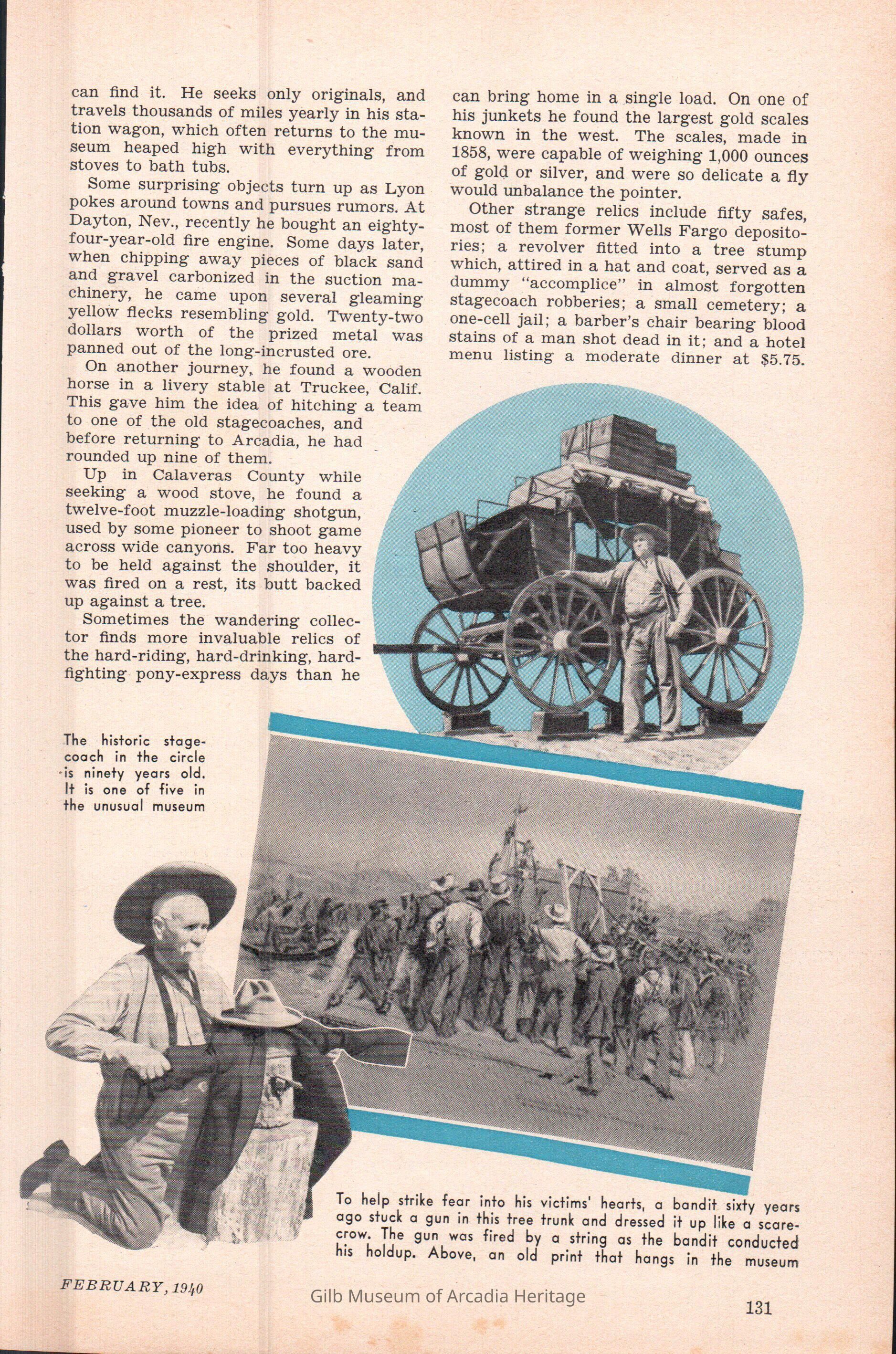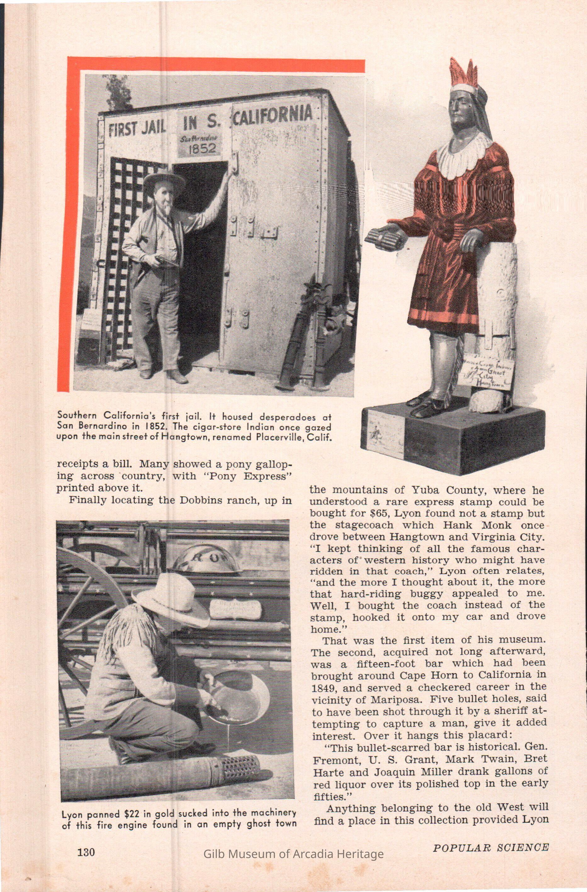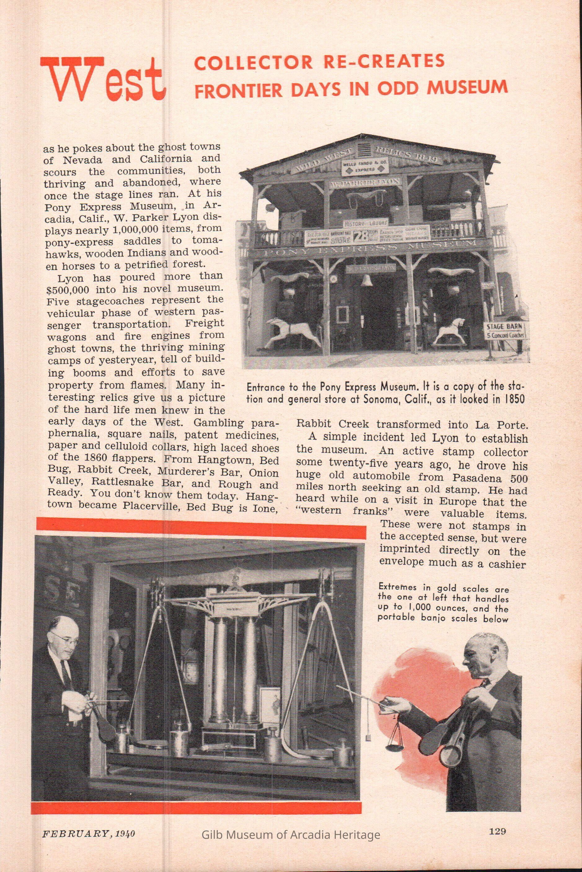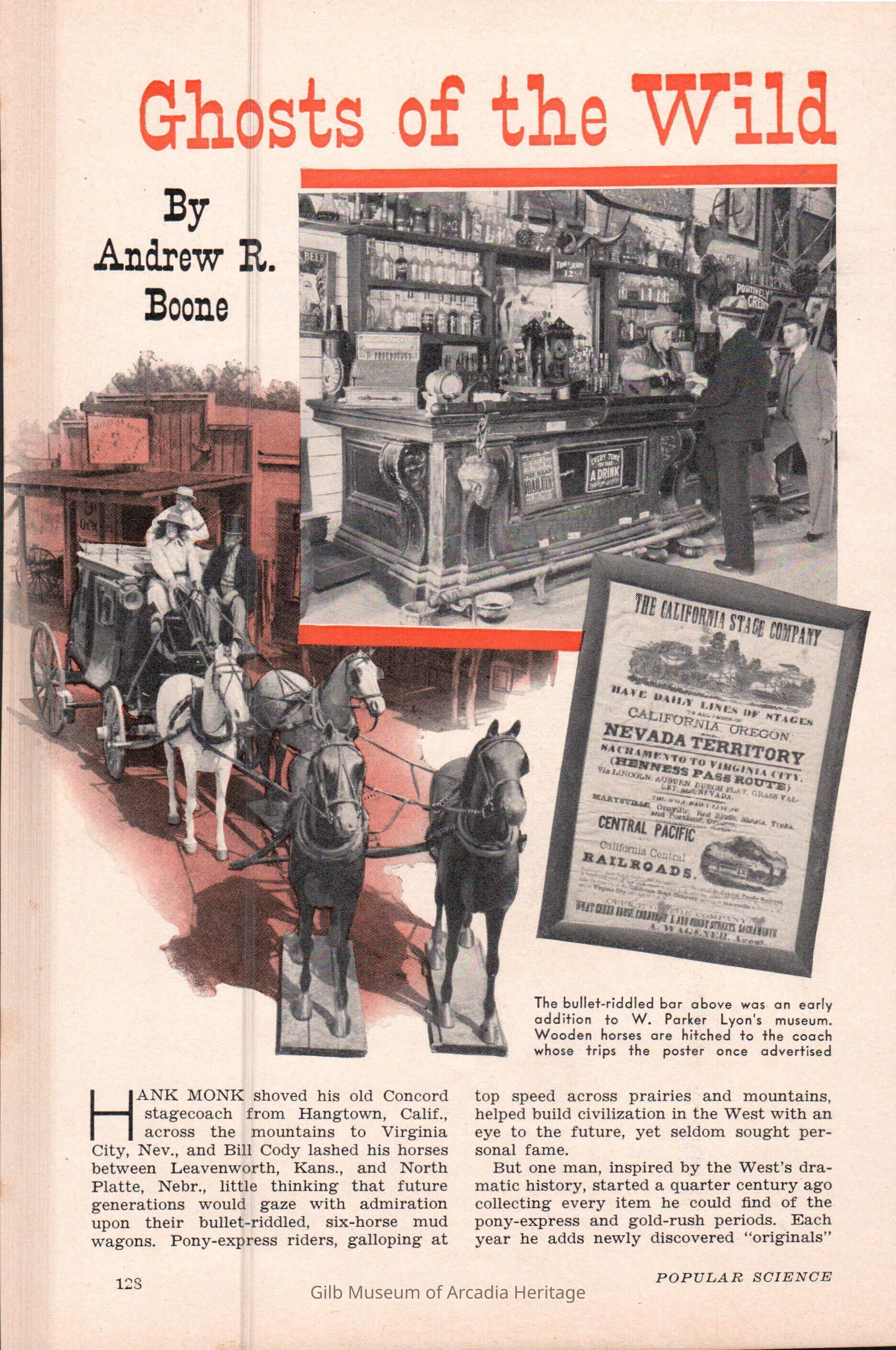 An article (4 pages) named "Ghost of the Wild" by Andrew R. Boone for Popular Science is about Parker Lyon and his motivations to create the Pony Express Museum in Arcadia, CA.