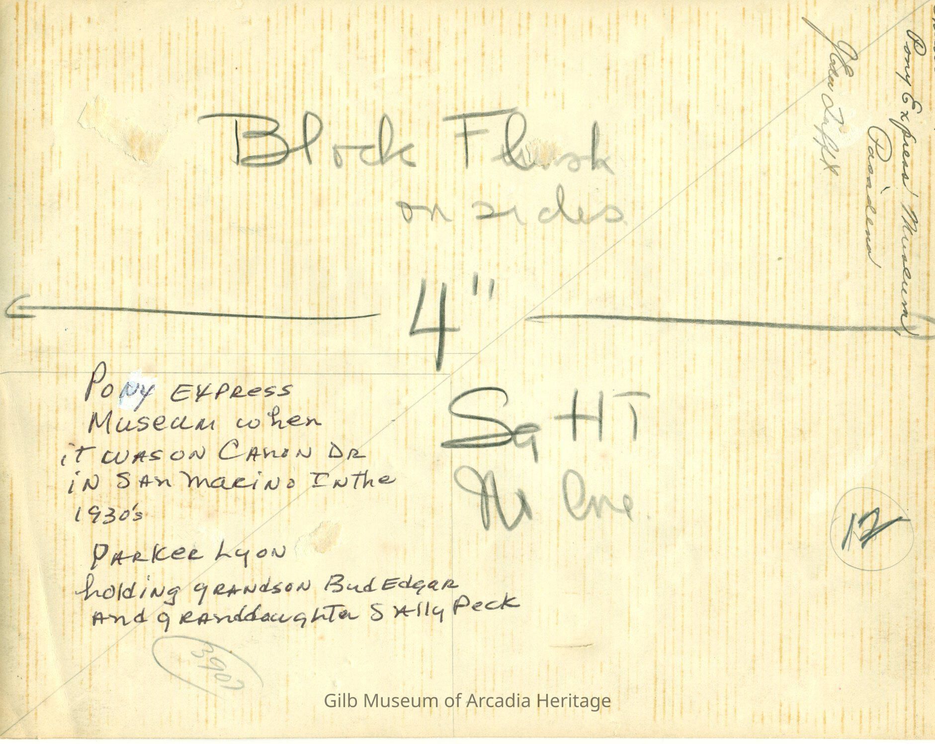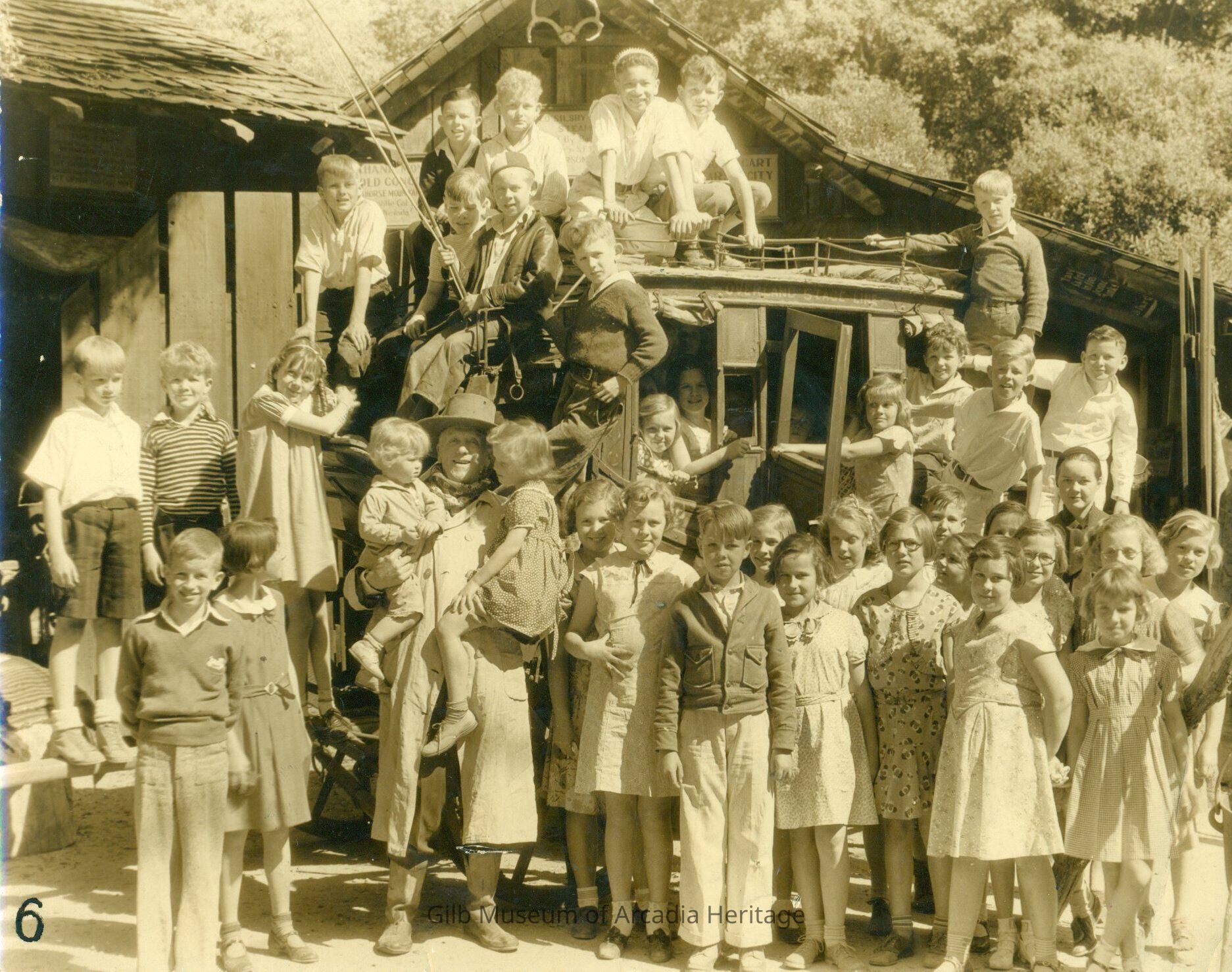 Black and white photograph of William Parker Lyon- the founder of the Lyon Van and Storage Company and creator of the first Pony Express Museum. Lyon moved his museum from Canon Drive in San Marino to Arcadia in 1934. His museum of western memorabilia was an instant success and drew record crowds to Arcadia until it's closure in 1955. In this c 1930s photograph he is seen in front of a stage coach with about 30 children when the museum was in San Marino. He is seen holding his grandson (Bud Edgar) and granddaughter Sally Peck. Parker Lyons is wearing western clothing with a long coat and a hat. A wooden building and many trees are seen in the background. The number (6) is written in black ink in the lower left hand corner. The reverse has some wording written in pencil and ink- this can be seen on one of the images in P2014.48.Collection