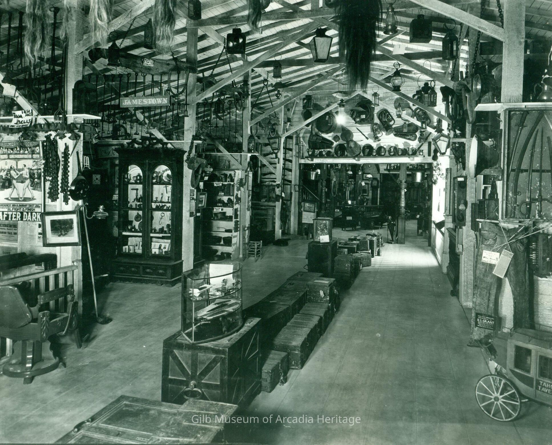 An early1950s or late 1940s black and white photograph with a small black border on the bottom and left sides of this photograph of the interior of Parker Lyon's Pony Express Museum in Arcadia. This section of the interior shows hundreds of items of western memorabilia hanging from the ceiling, on shelves and in locked glass and wood cases. Examples of what's seen in this area are trunks, boxes, photos, swords, pots, barber tools bells, lamps clocks, musical instruments, guns and hundreds of other items found from our old west. The building is made of wood with large plank flooring and a beam ceiling. The Pony Express Museum closed in 1955.Collection