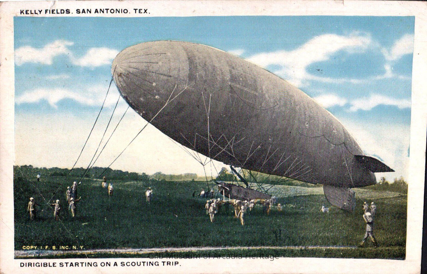 Front of postcard: A balloon ground crew holds ropes attached to a dirigible in Kelly Fields, San Antonio, Texas.Collection