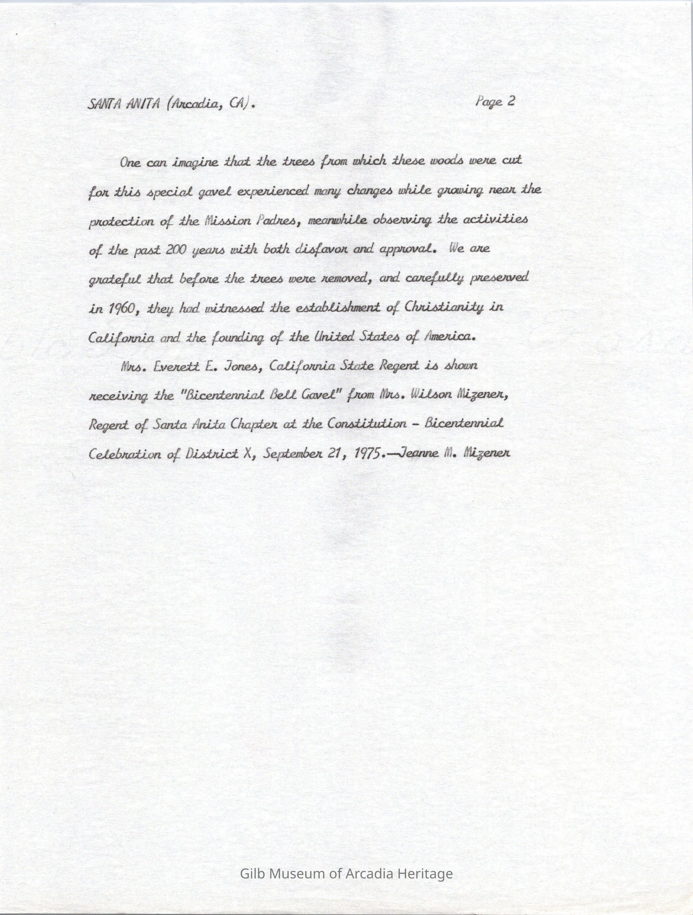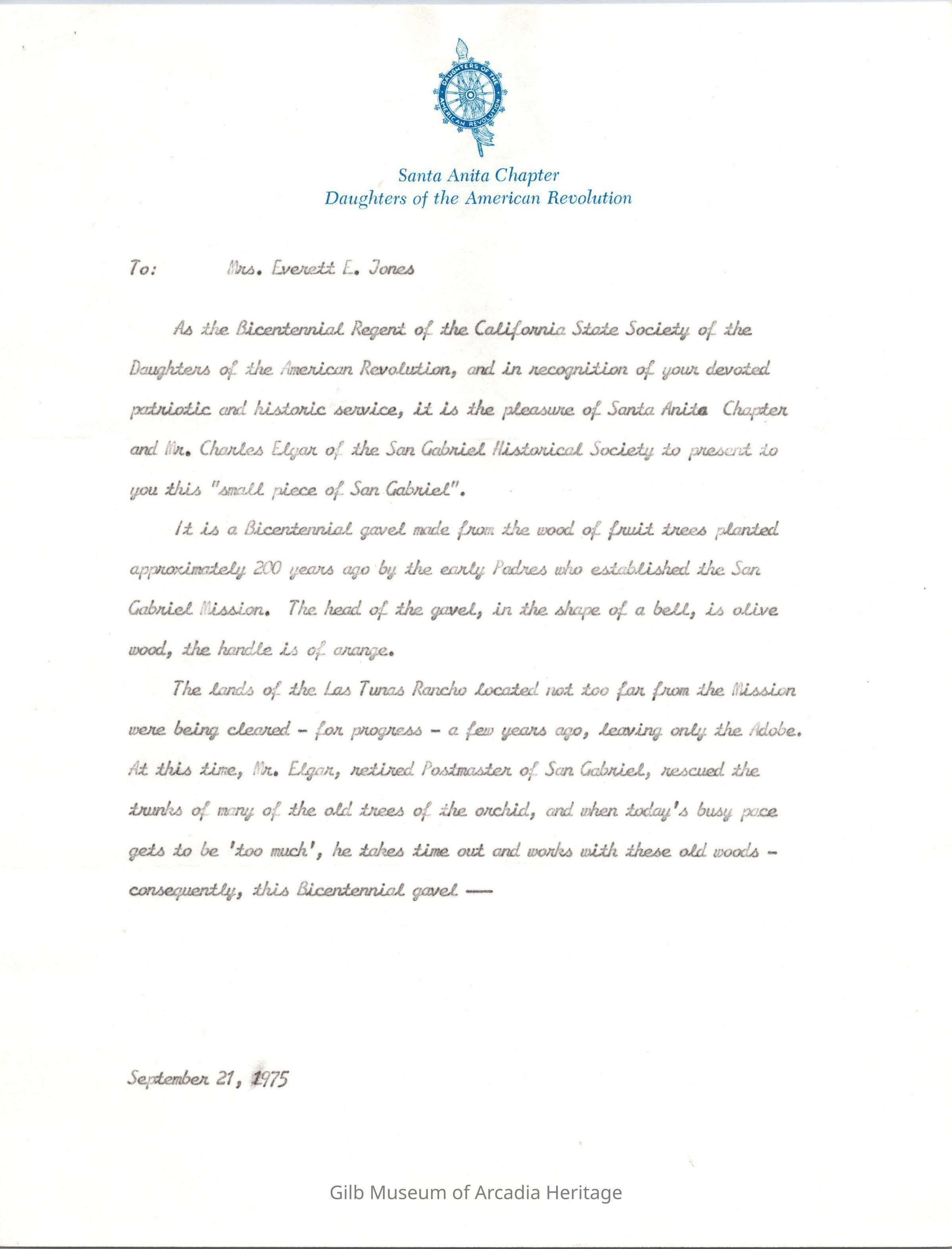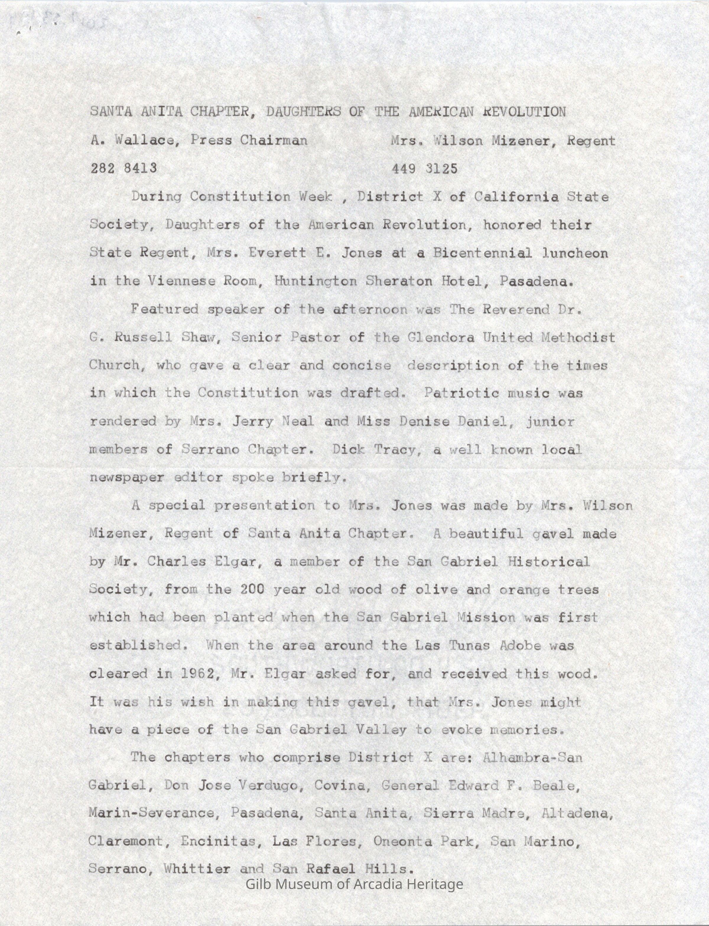 The Bicentennail Bell Gavel presentation to the Santa Anita Chapter D.A.R. and the Regent Mrs. Everett E. Jones.
