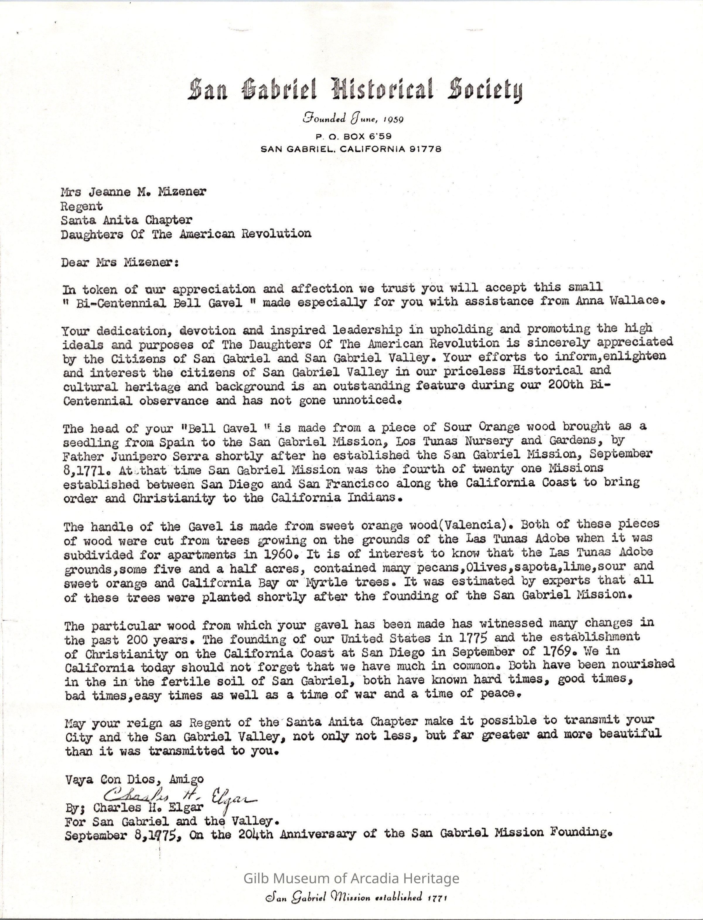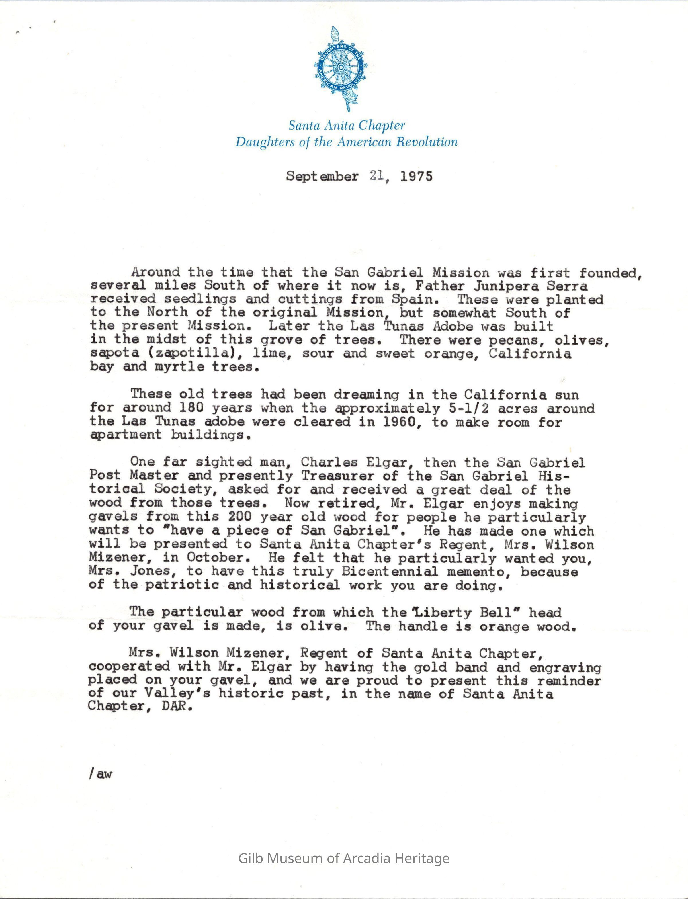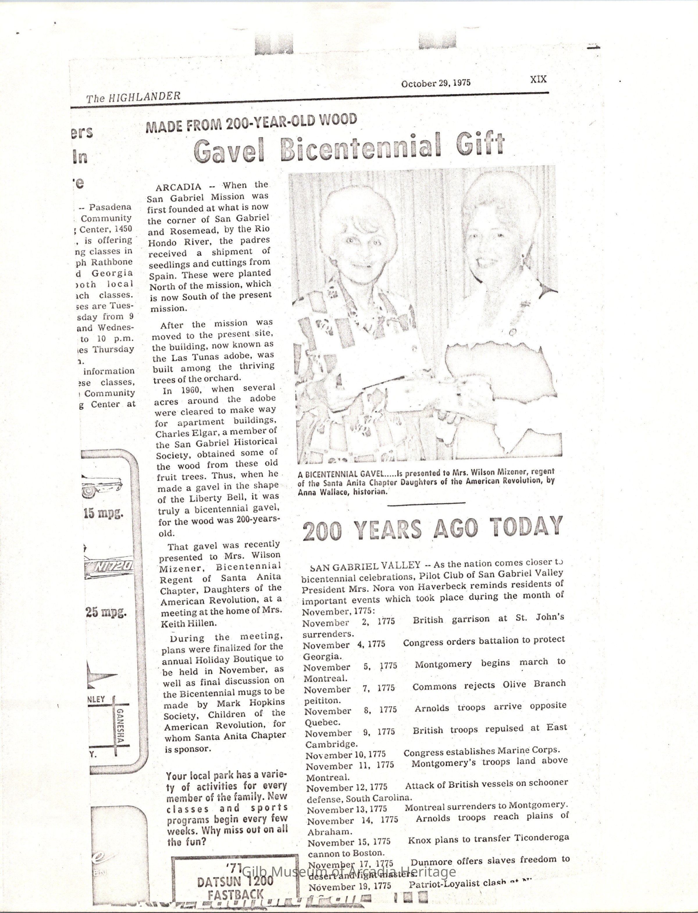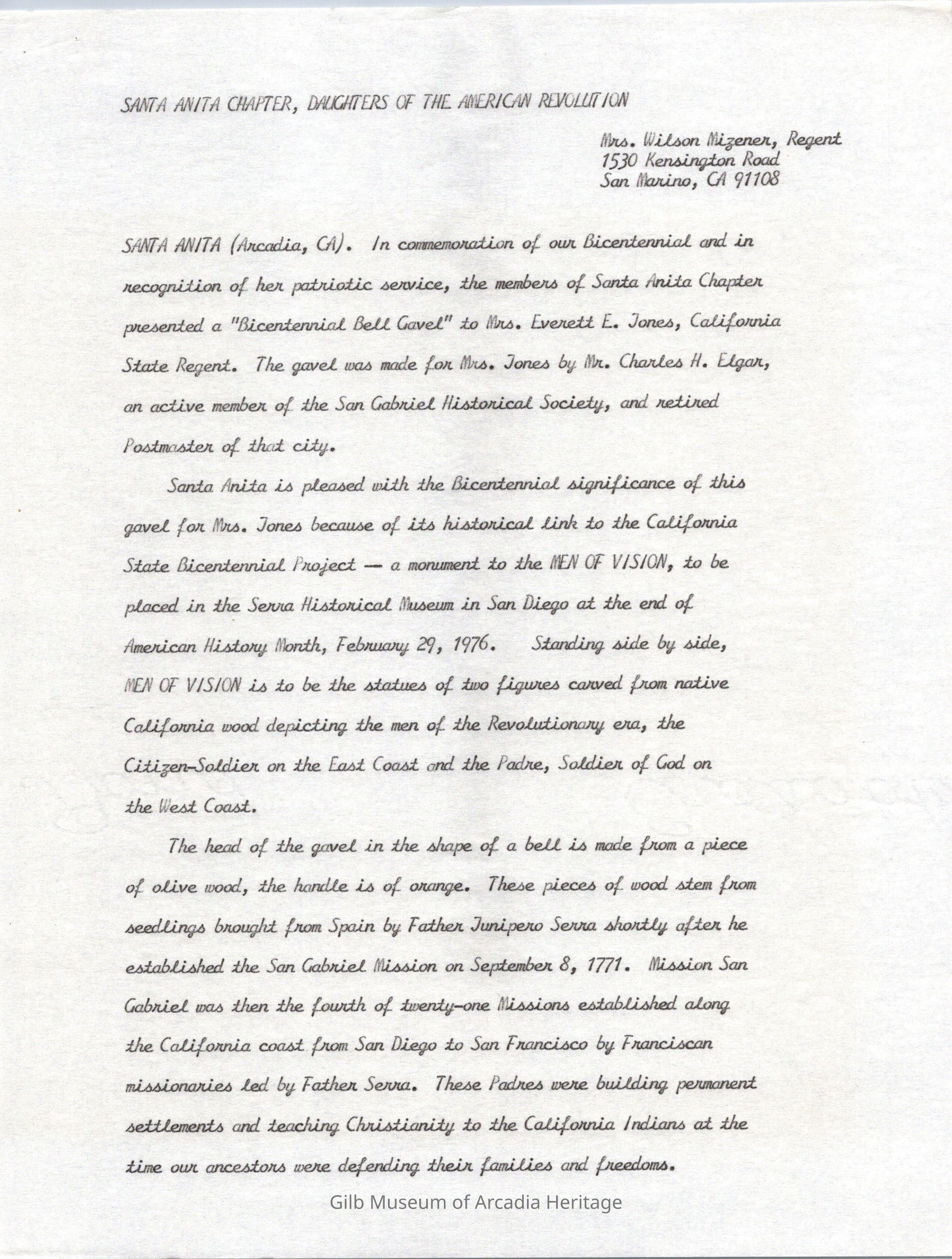 The Bicentennail Bell Gavel presentation to the Santa Anita Chapter D.A.R. and the Regent Mrs. Everett E. Jones.