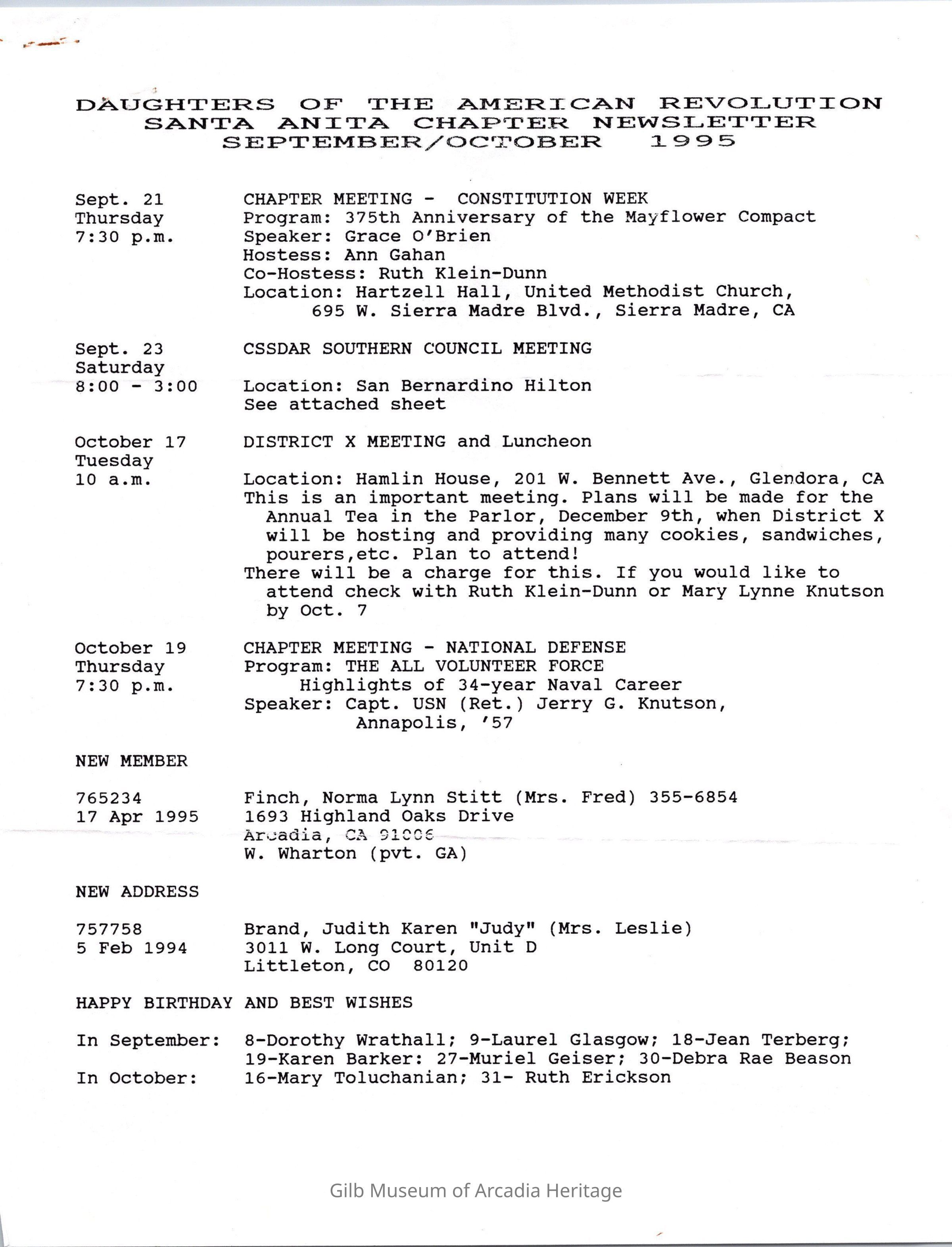 DAR: Santa Anita Chapter NSDAR September/October 1995 NewsletterEntry/Object ID