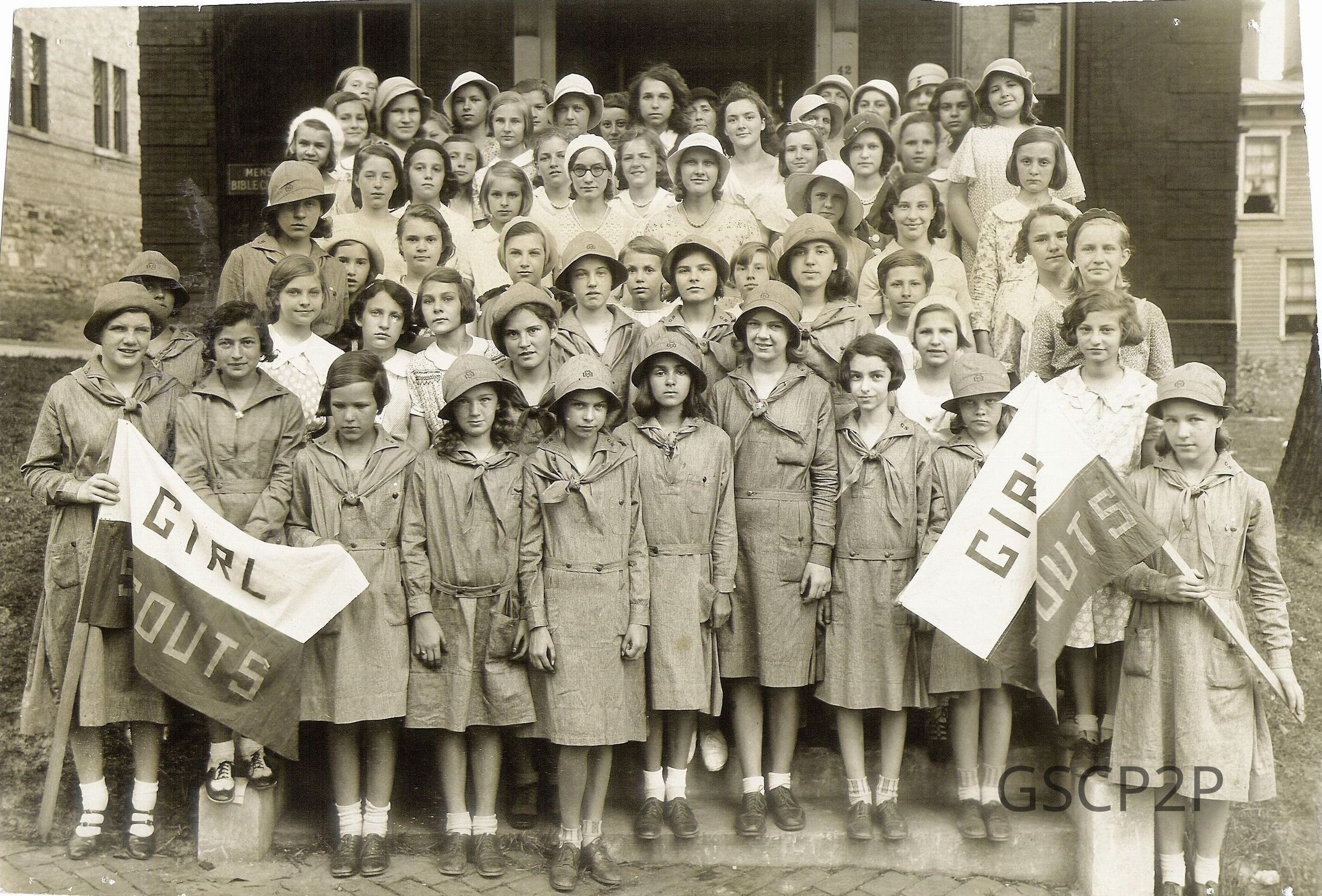 Large group of Girl Scouts in uniform with Girl Scout flagsPhotograph Details