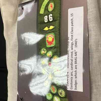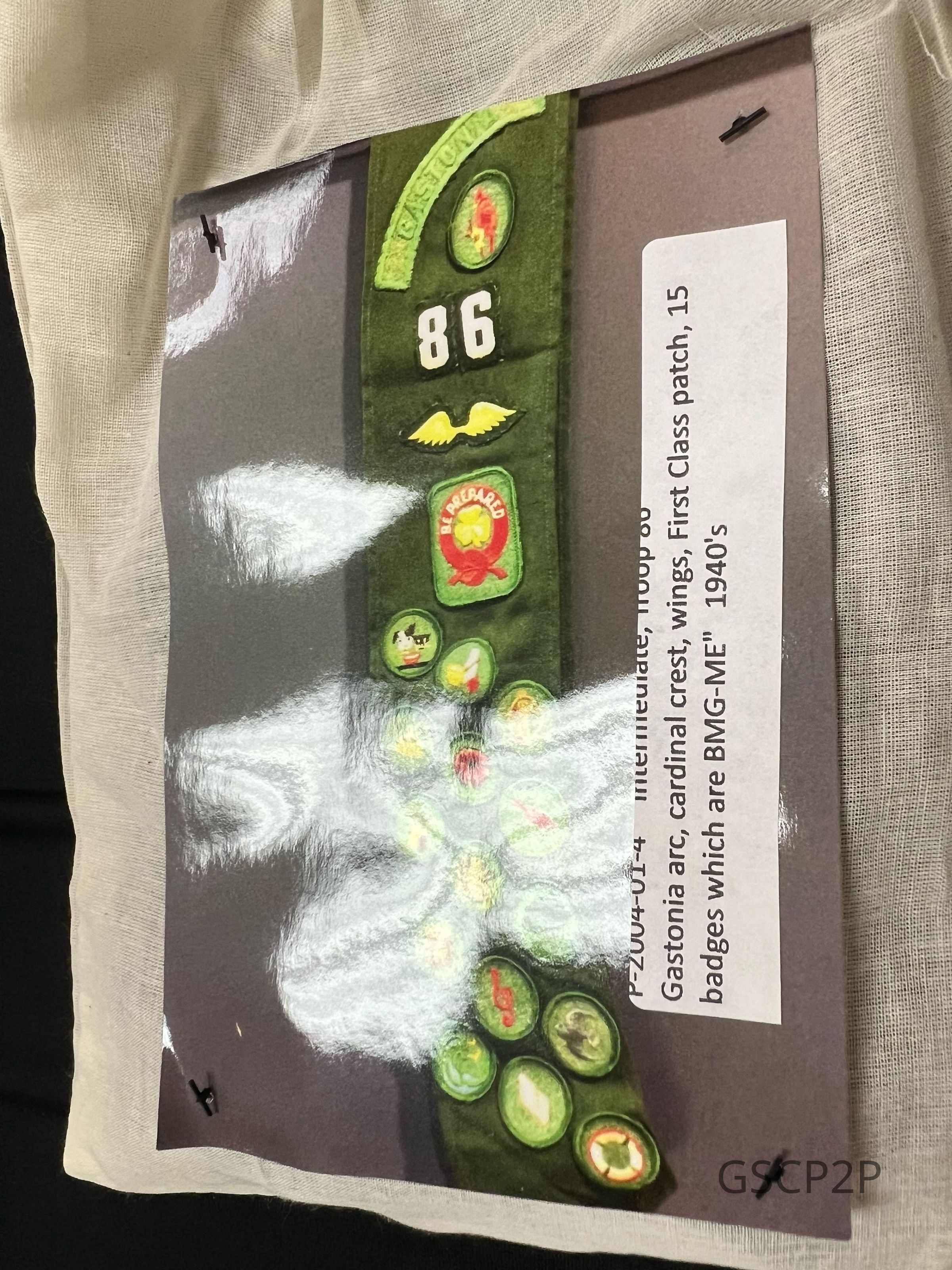 Troop 86 Intermediate Sash with Gastonia arc, cardinal crest, wings, First Class patch and various badges.Context