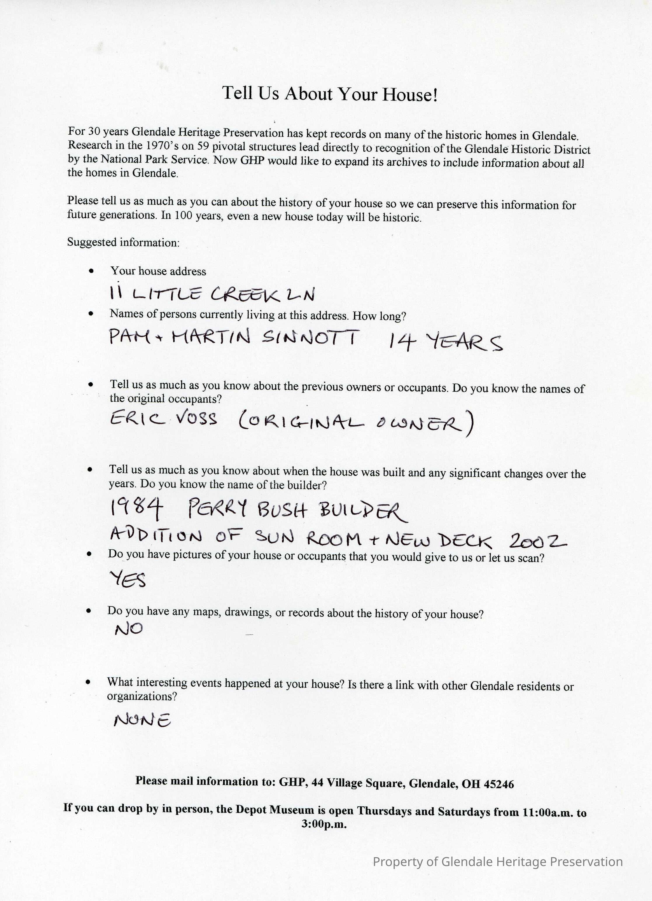 Original owner - Eric Voss. Current residents - Pam and Martin Sinnott, Perry Bush was the builder.Lexicon