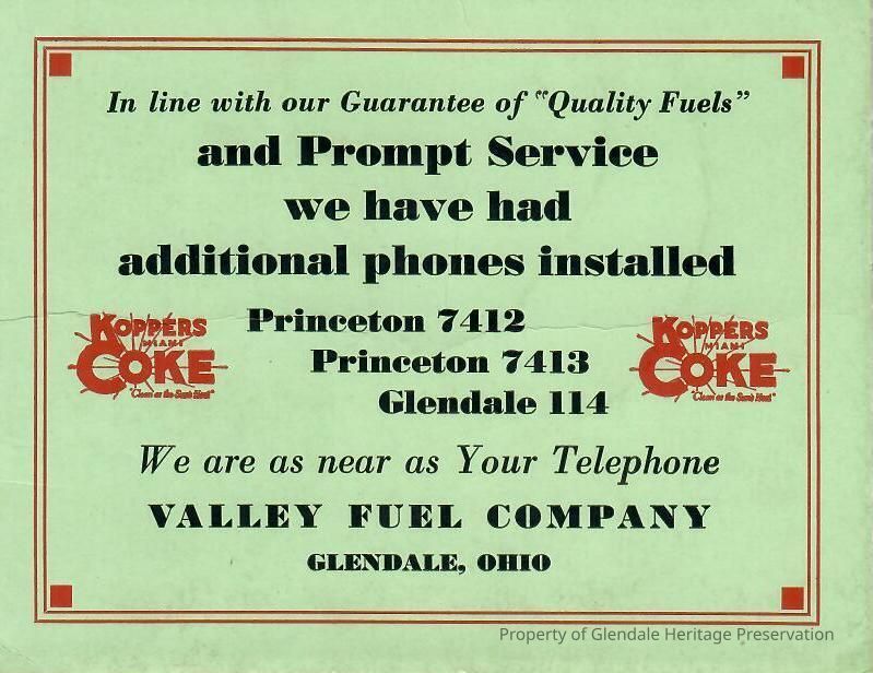 Advertisement Card- Valley Fuel Company, Glendale, Ohio