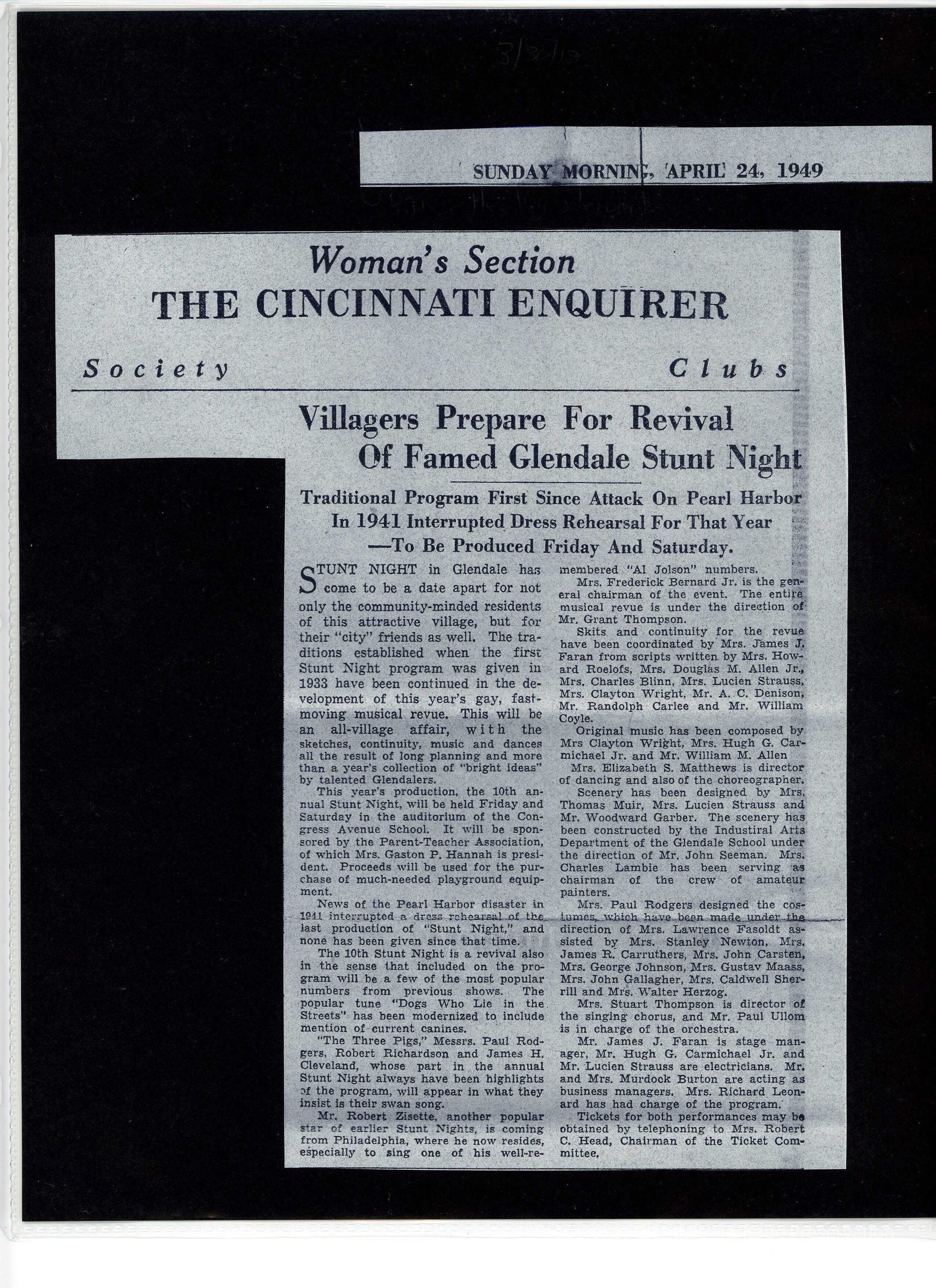 Newspaper article from the Cincinnati Enquirer, April 24, 1949. Article headlines read: