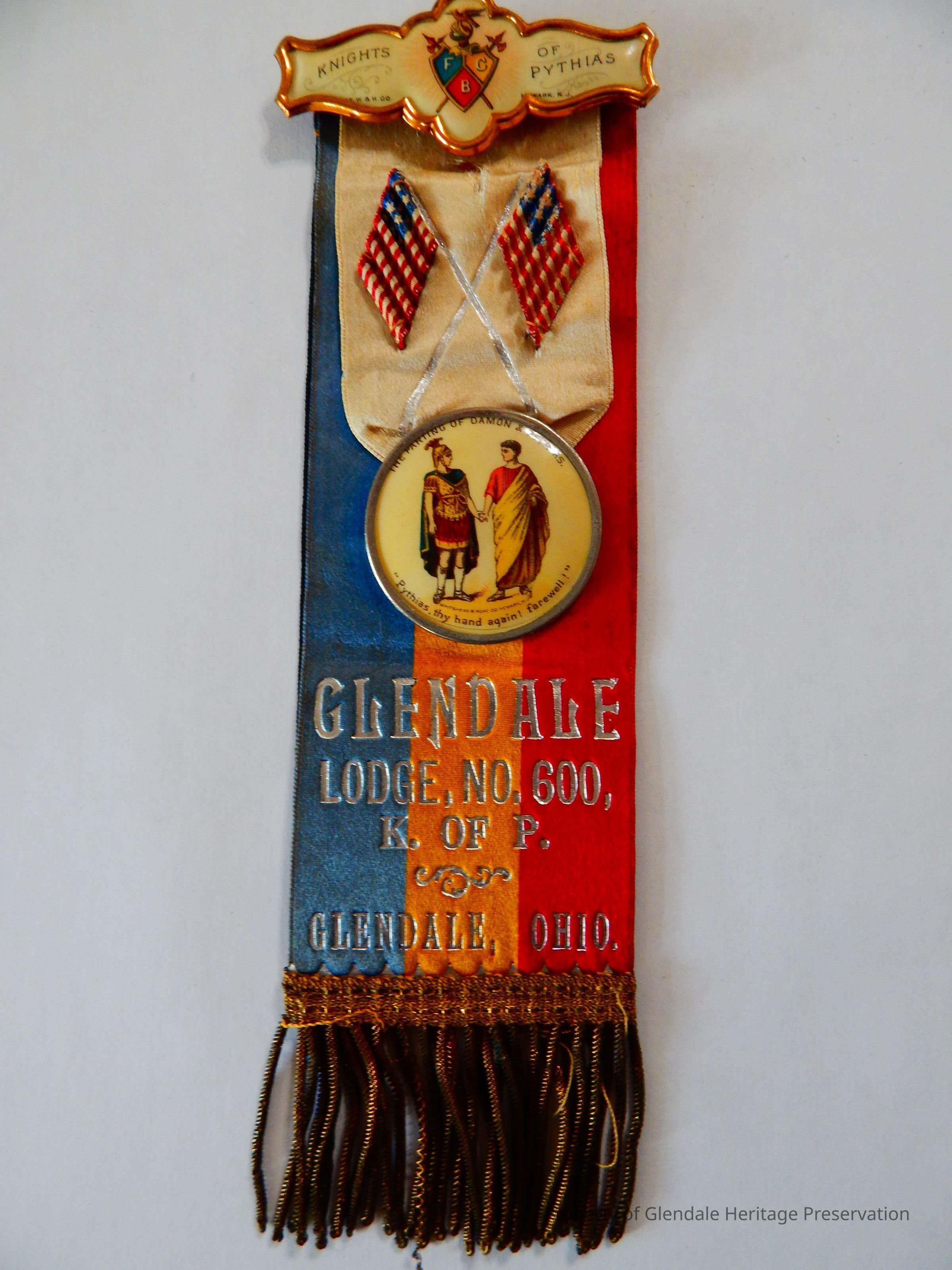 Charter from the Cincinnati Grand Lodge of the Free and Accepted Masons of Ohio granting the establishment of a Lodge in Glendale No. 186. Dated November 29, 1887. Included as well a Ribbon and Pin with the words Glendale Lodge no. 600, K. of P. and a history of the Pythagorean Brotherhood.Create Date