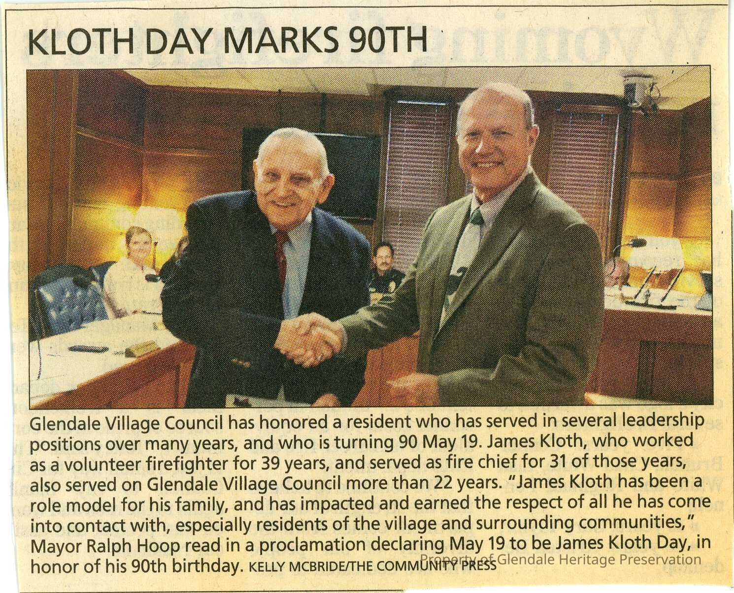 Mayor Ralph Hoop presents James Kloth with a proclamation declaring May 19, 2013 to be James Kloth Day. Mr. Kloth served in the Glendale Fire department for 39 years and Fire Chief for 31 of those years. He also served on Village Council for more than 22 years. May 19, 2013 was his 90th birthday.Lexicon