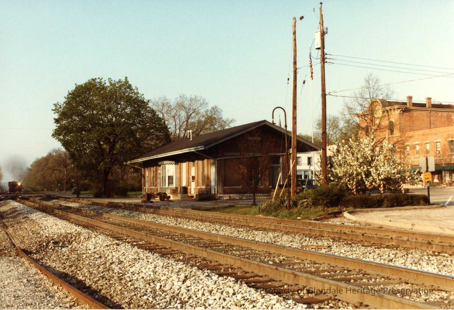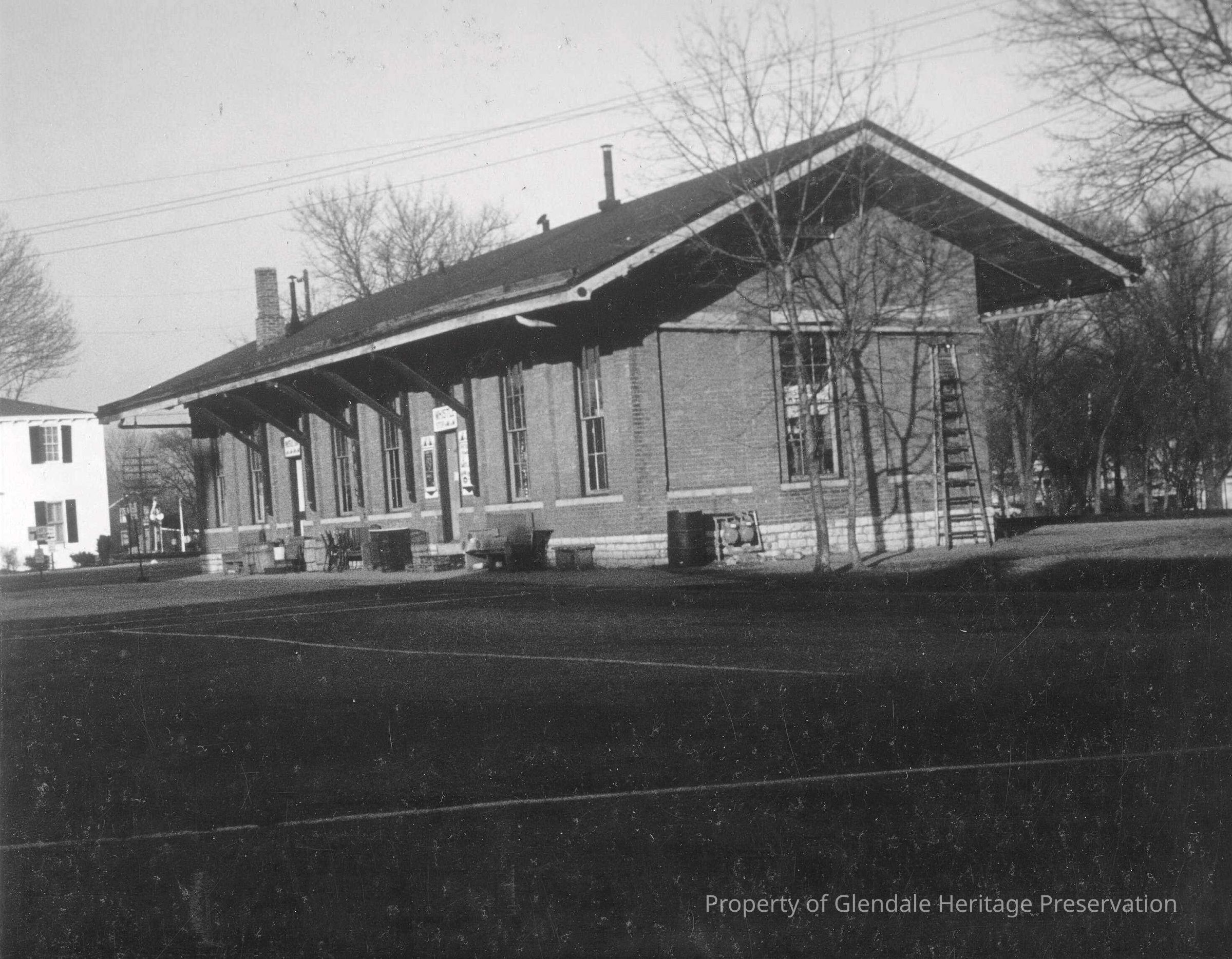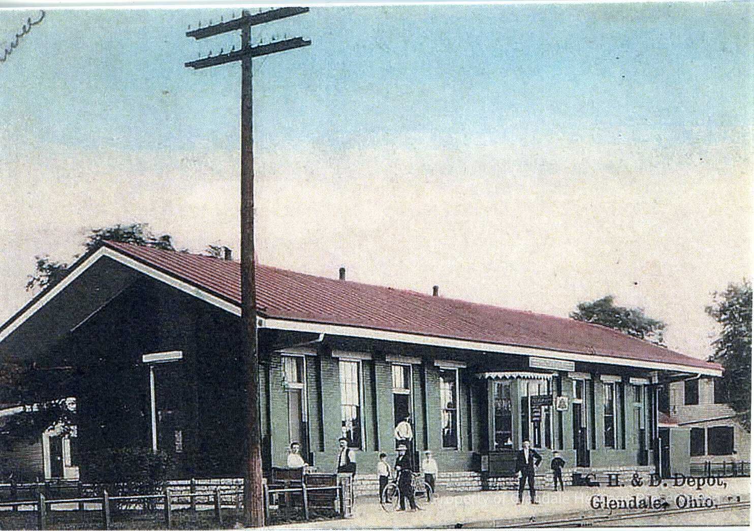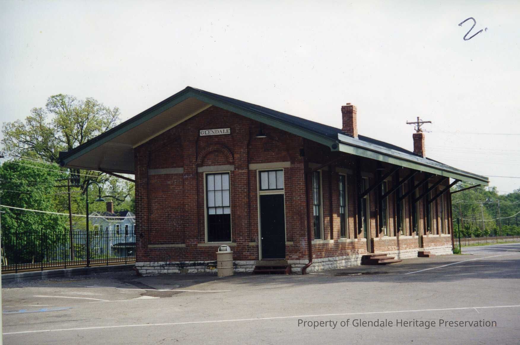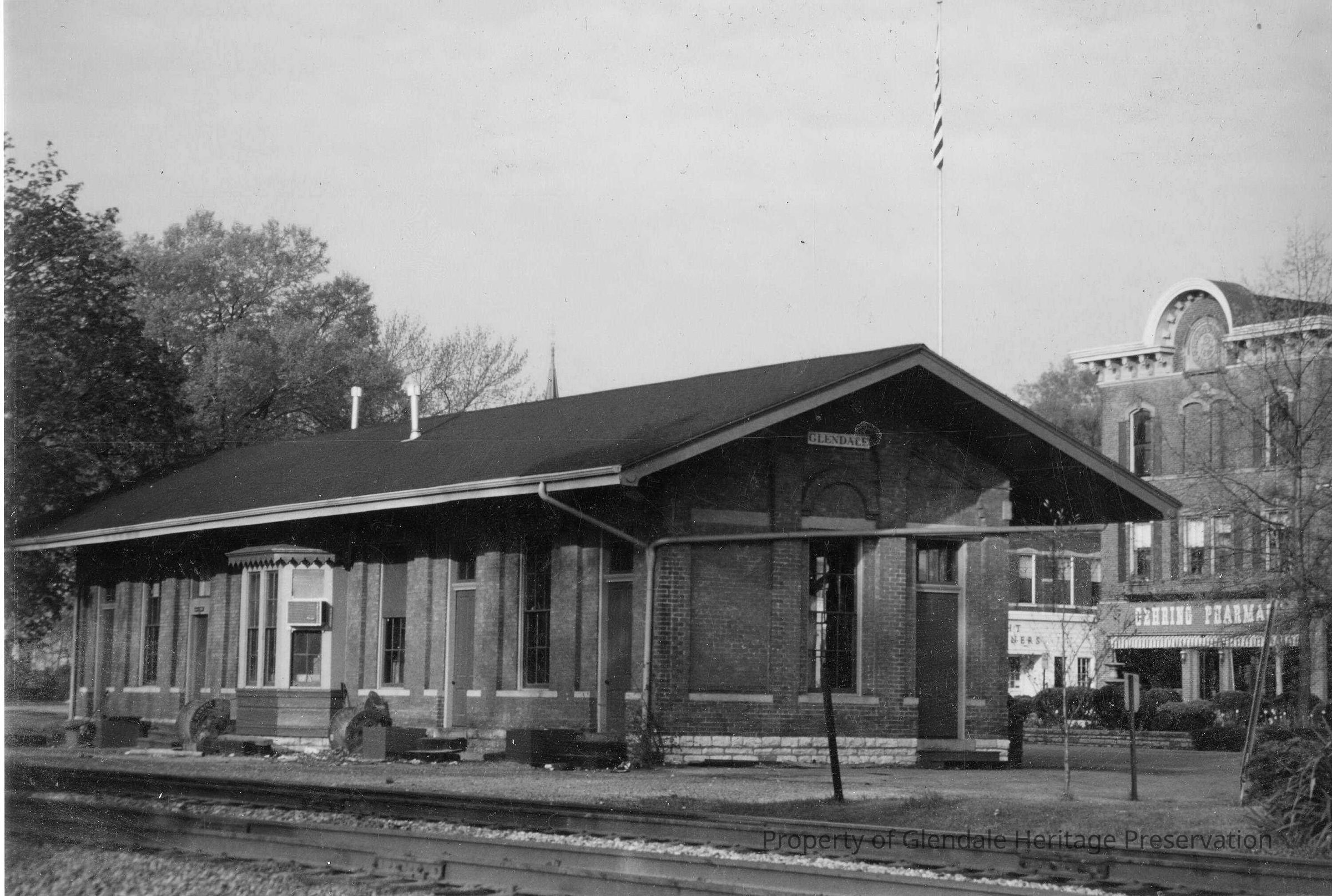 Glendale was once the terminus of the commuter line of the Cincinnati Hamilton & Dayton Railroad. The first station built on this site c. 1859 was a white wooden gothic style building. This building was destroyed in the fire of 1880. It was replaced by the brick structure. In 2020 information was made known that contradicts this timeline. Please see attached document with information from the C.H. & D Railroad records. It turns out this is a very rare photo because it shows both sets of tracks.