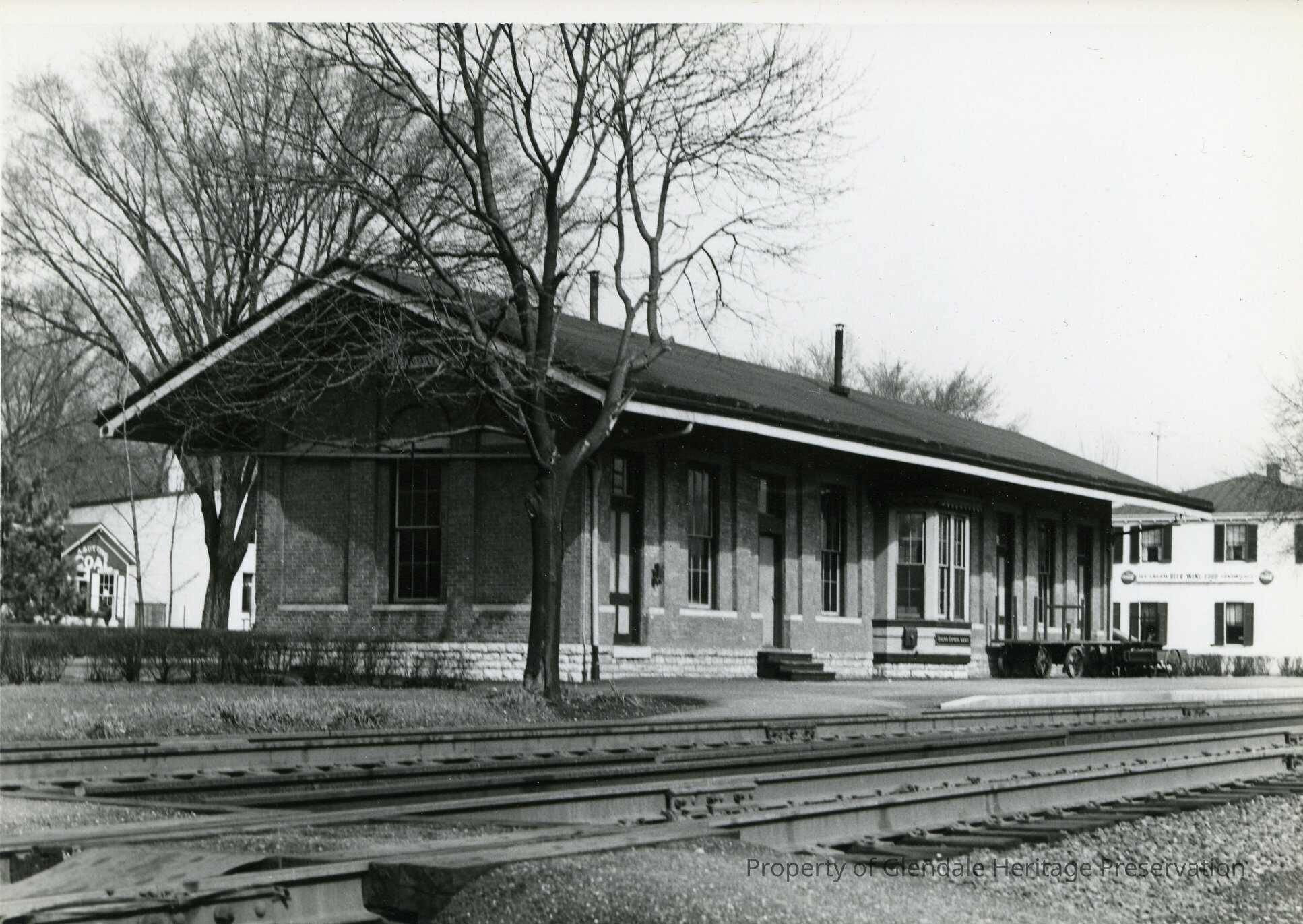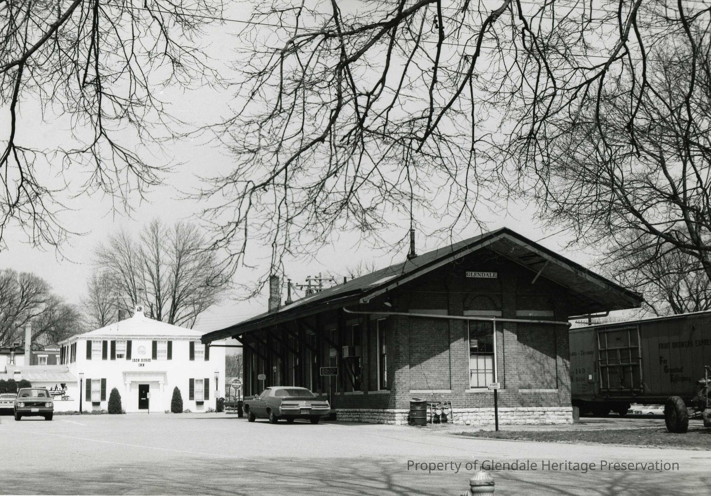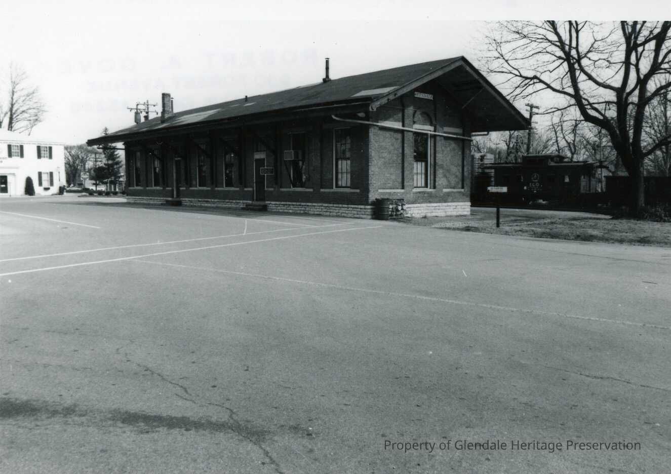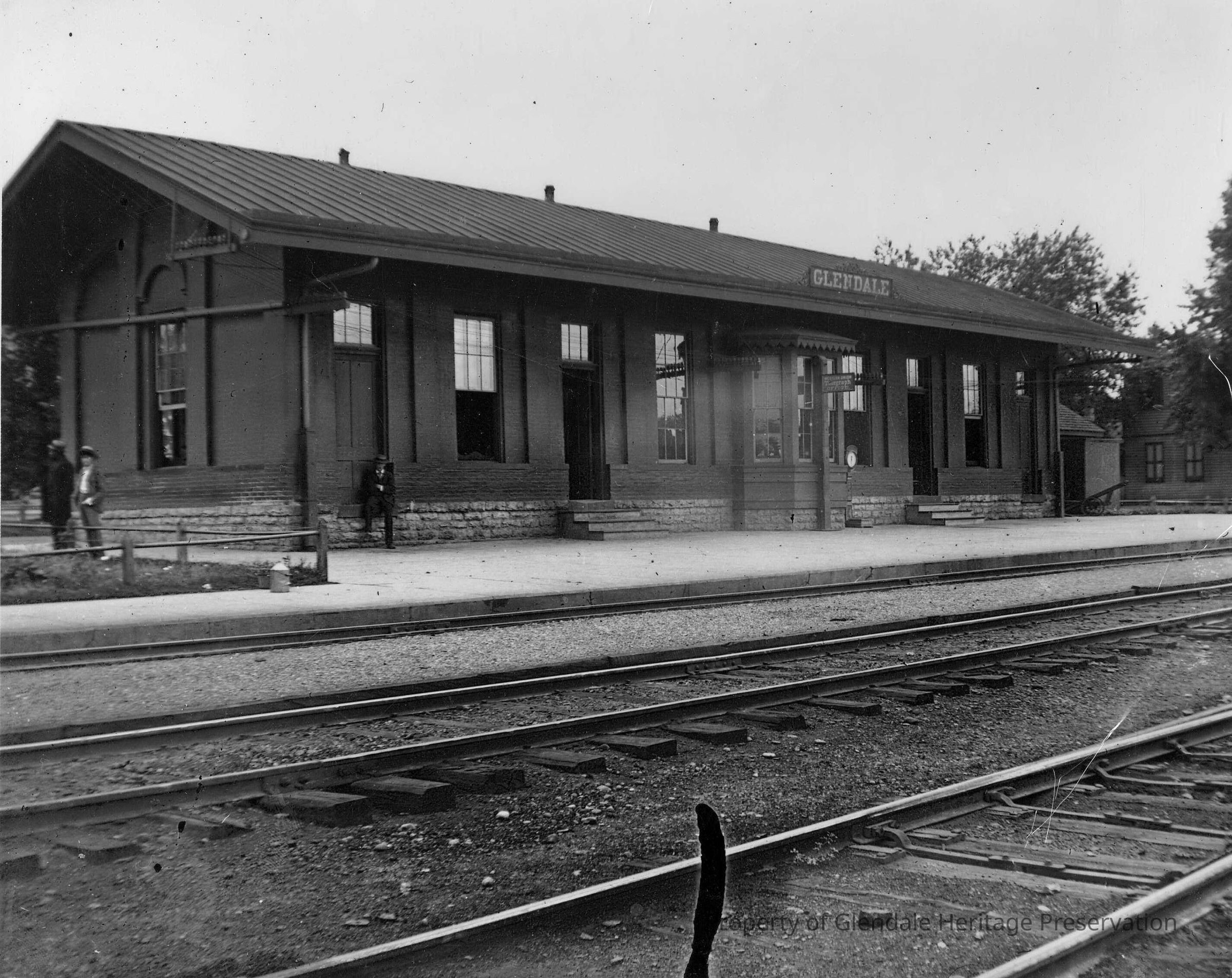 Glendale was once the terminus of the commuter line of the Cincinnati Hamilton & Dayton Railroad. The first station built on this site c. 1859 was a white wooden gothic style building. This building was destroyed in the fire of 1880. It was replaced by the brick structure. In 2020 information was made known that contradicts this timeline. Please see attached document with information from the C.H. & D Railroad records. It turns out this is a very rare photo because it shows both sets of tracks.