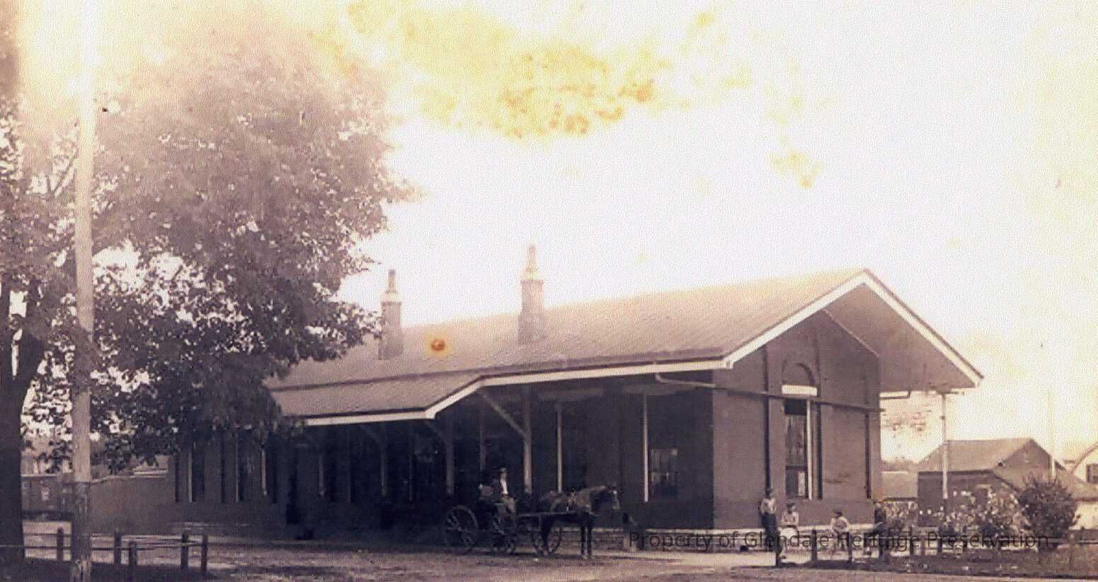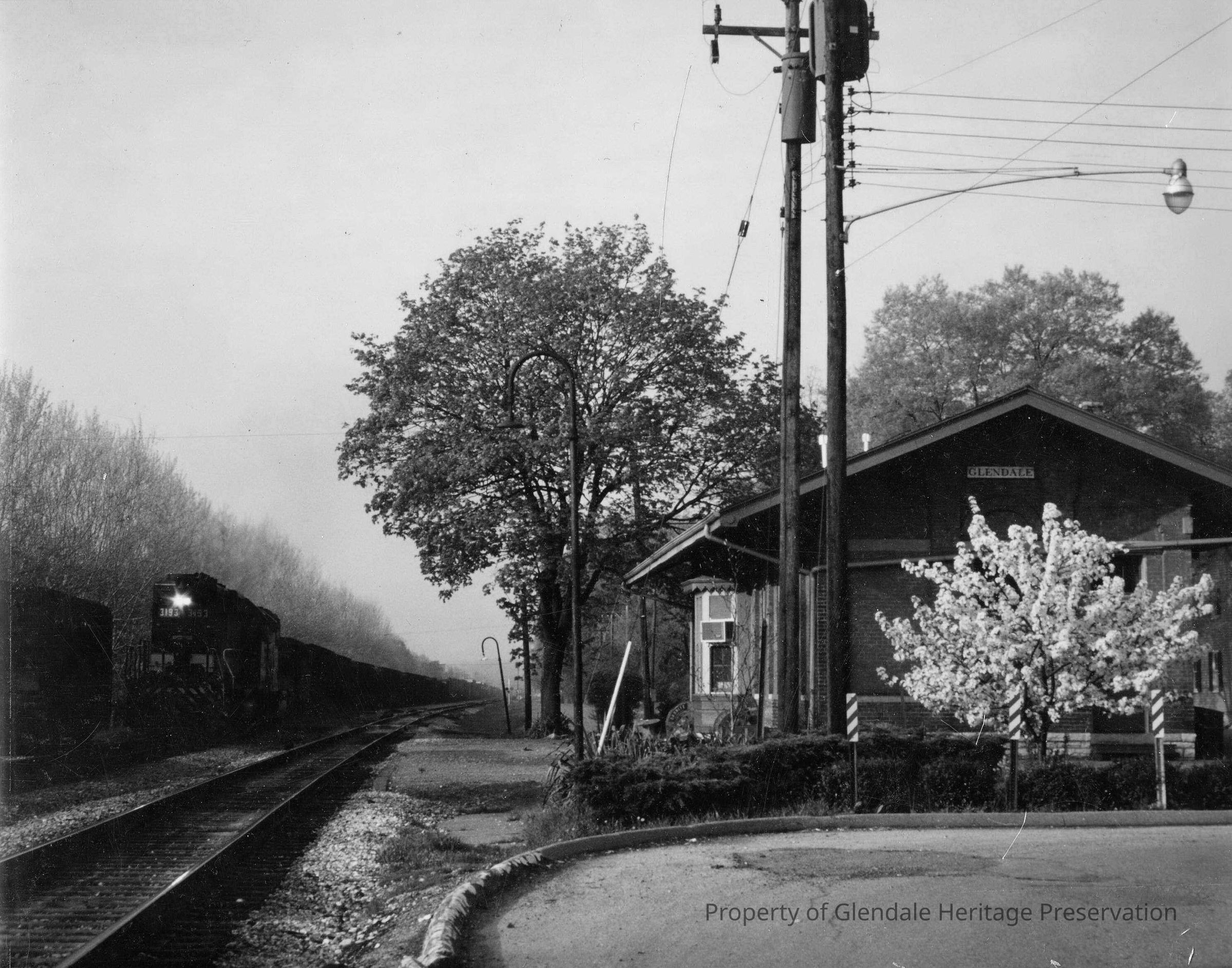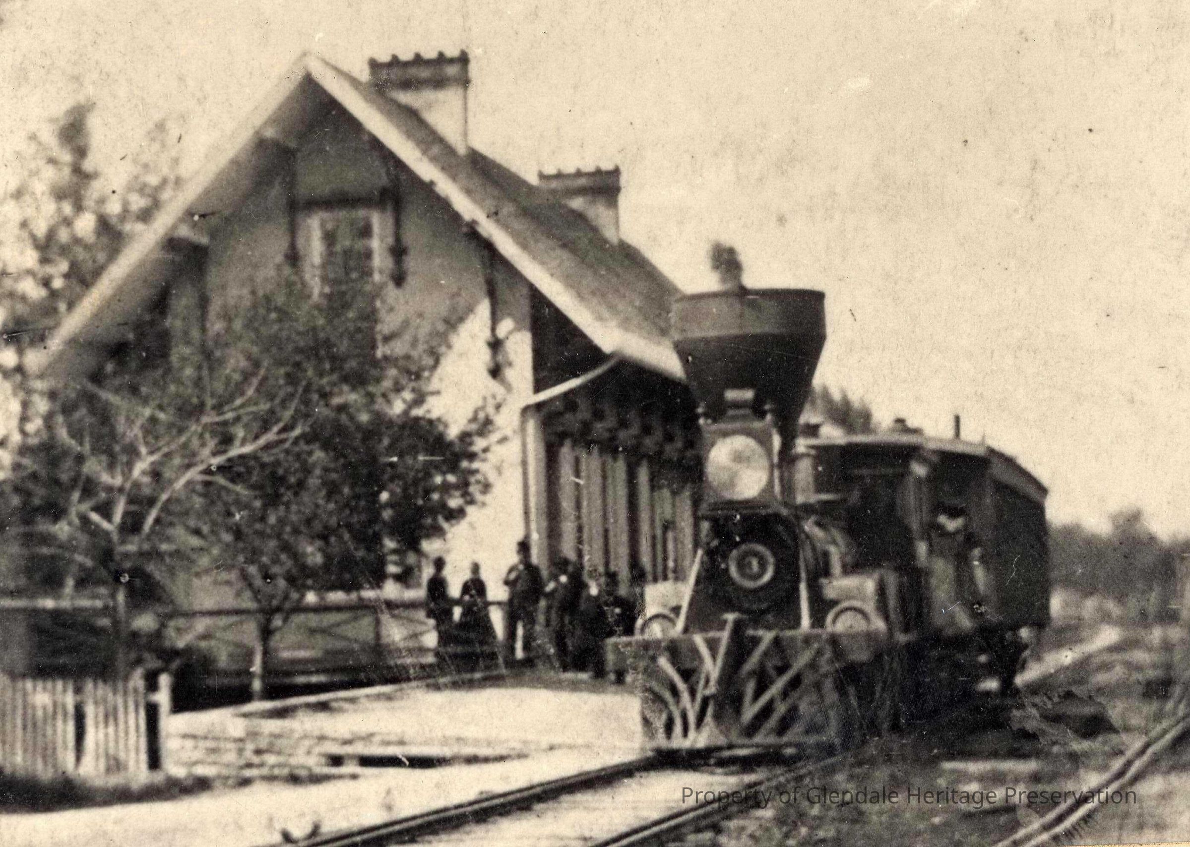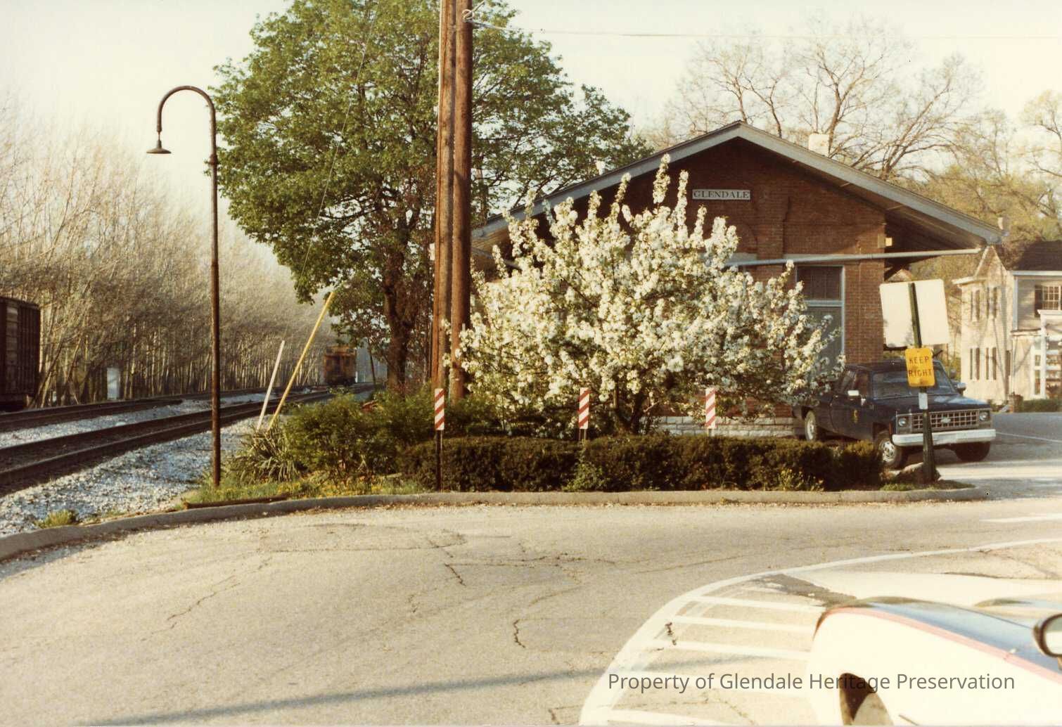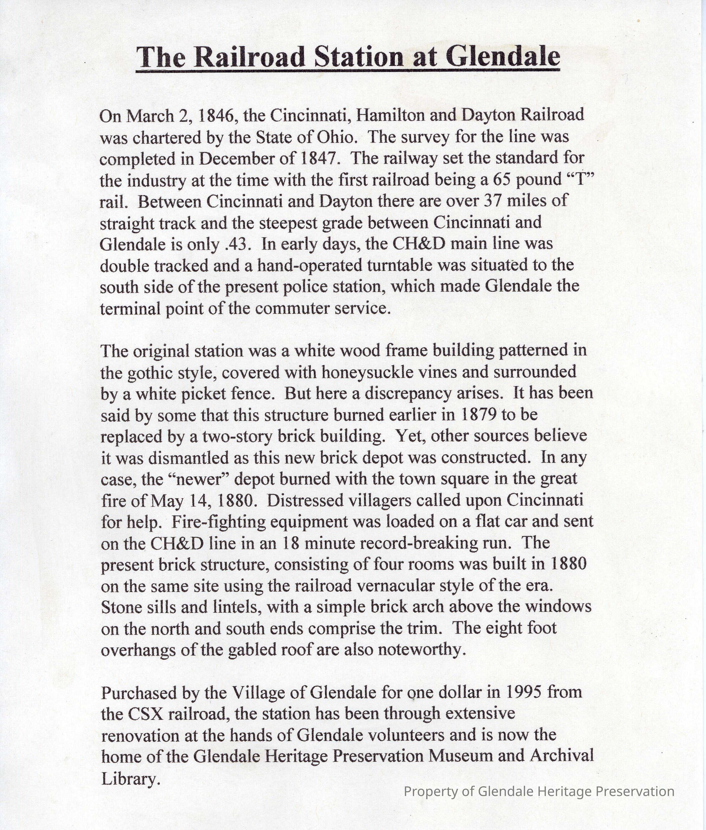 Glendale was once the terminus of the commuter line of the Cincinnati Hamilton & Dayton Railroad. The first station built on this site c. 1859 was a white wooden gothic style building. This building was destroyed in the fire of 1880. It was replaced by the brick structure. In 2020 information was made known that contradicts this timeline. Please see attached document with information from the C.H. & D Railroad records. It turns out this is a very rare photo because it shows both sets of tracks.