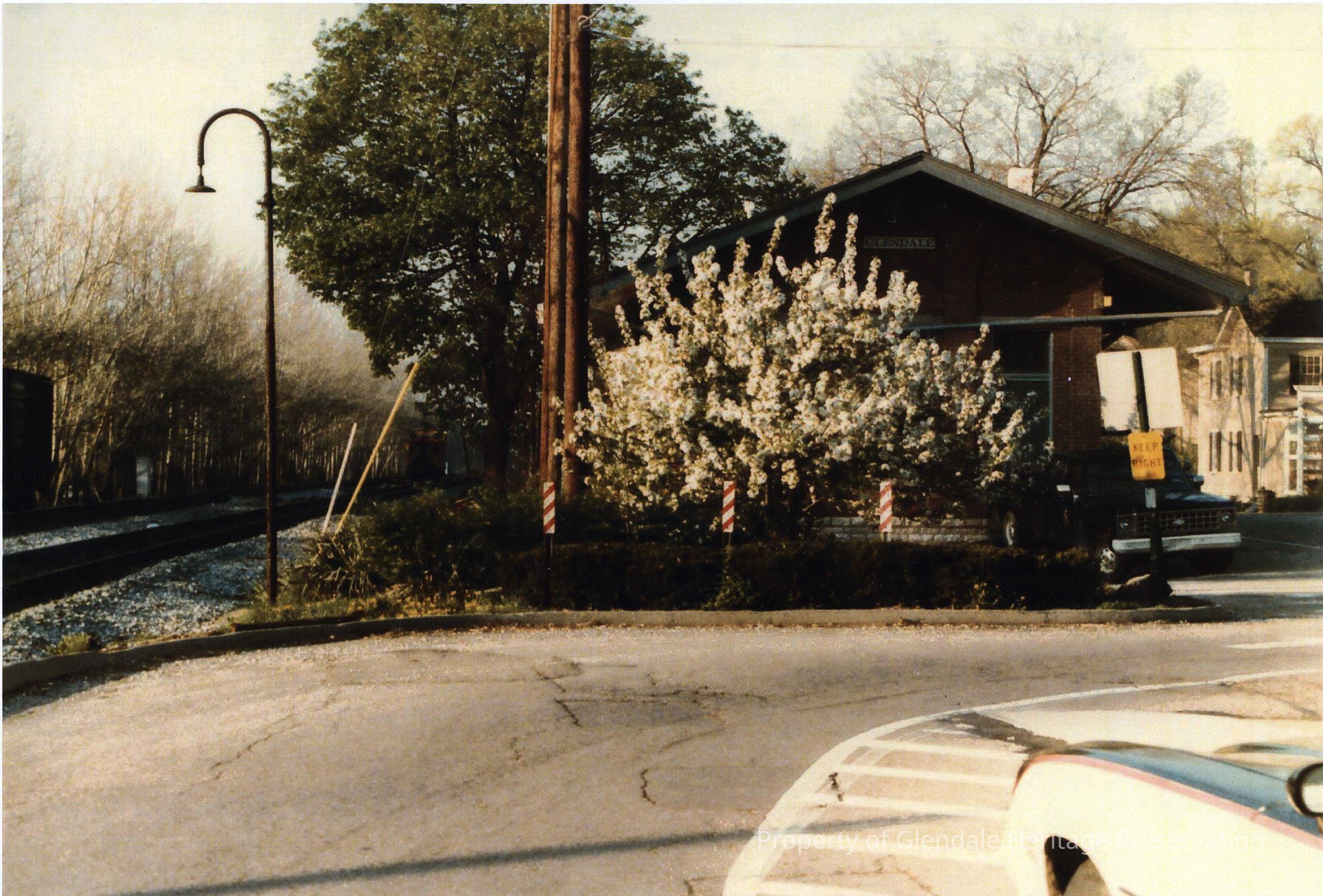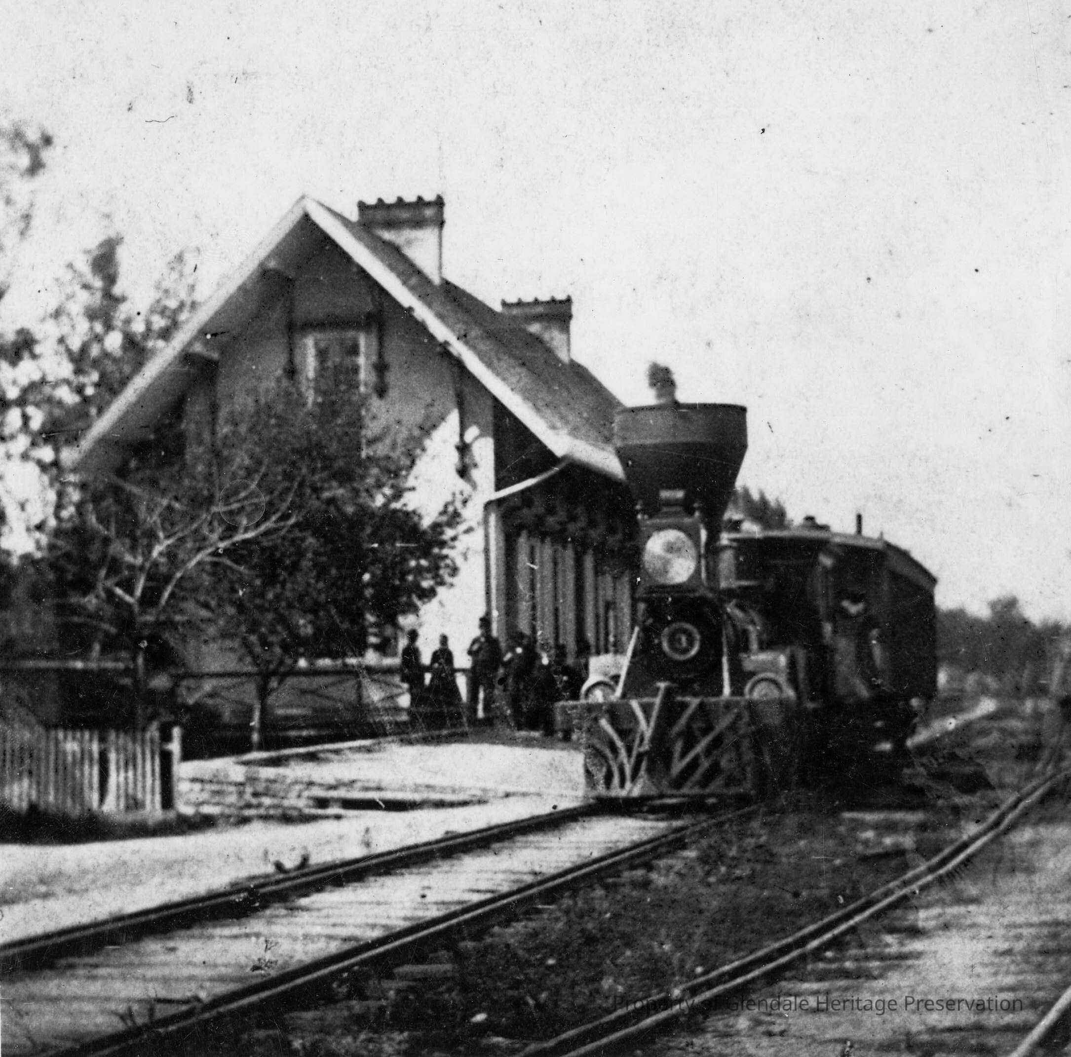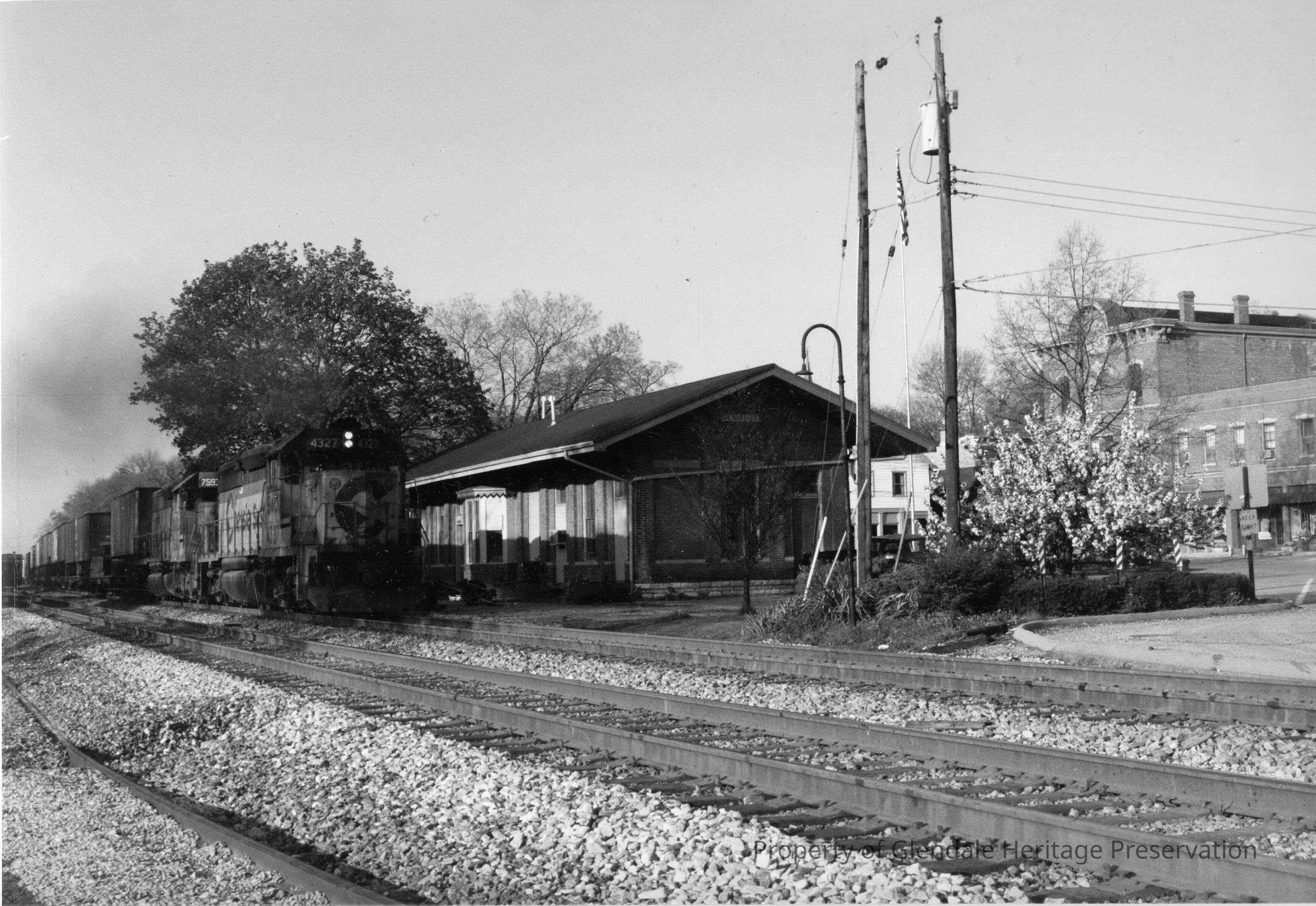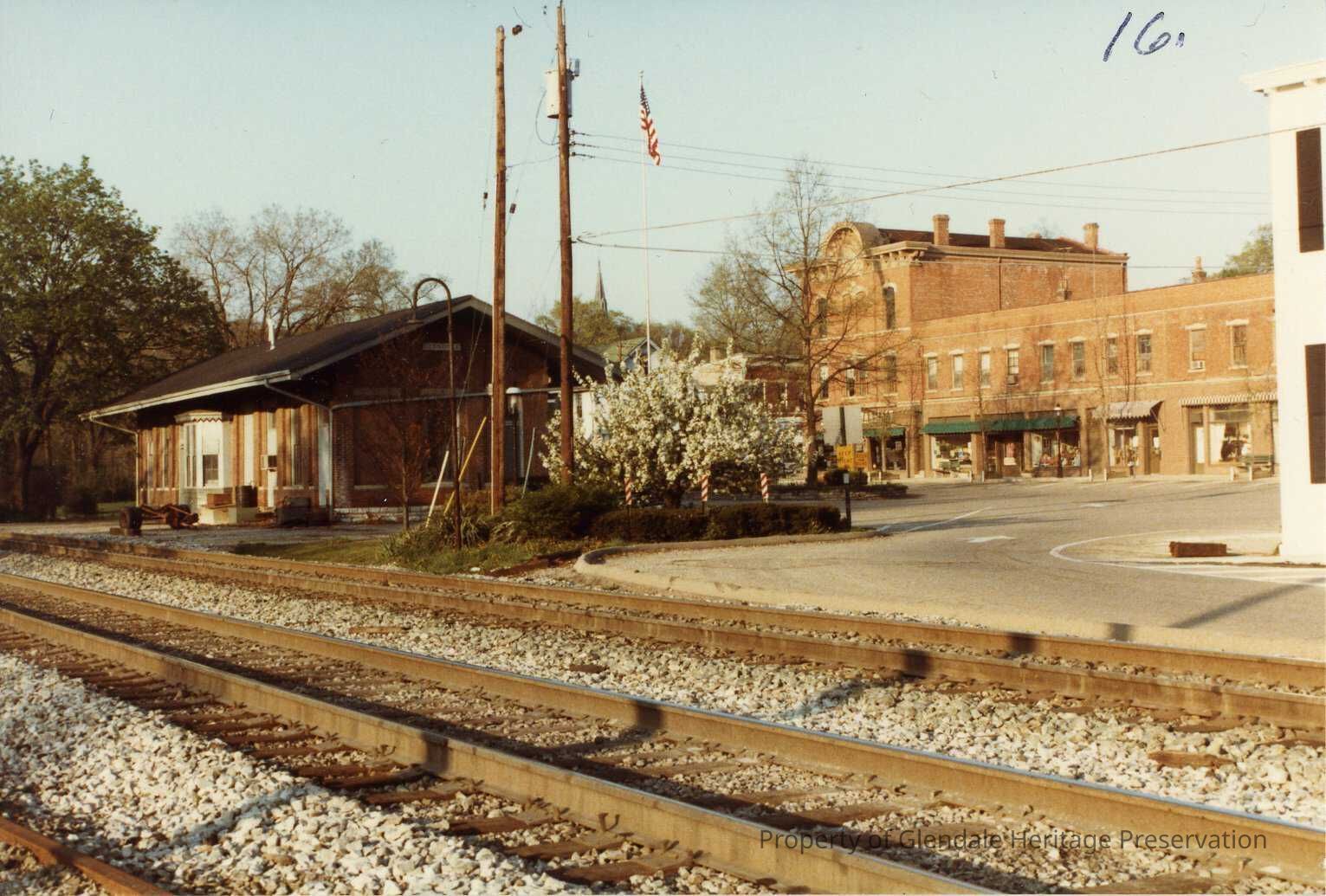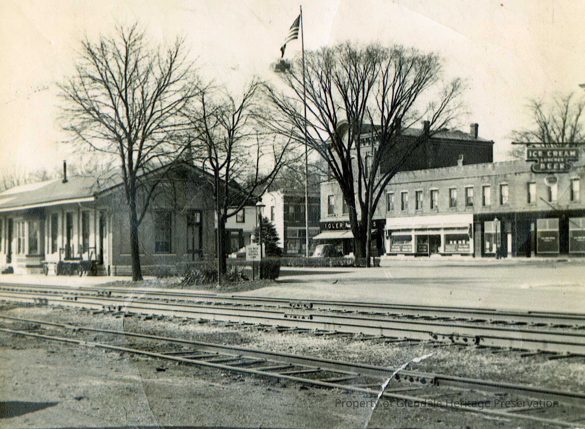 Glendale was once the terminus of the commuter line of the Cincinnati Hamilton & Dayton Railroad. The first station built on this site c. 1859 was a white wooden gothic style building. This building was destroyed in the fire of 1880. It was replaced by the brick structure. In 2020 information was made known that contradicts this timeline. Please see attached document with information from the C.H. & D Railroad records. It turns out this is a very rare photo because it shows both sets of tracks.