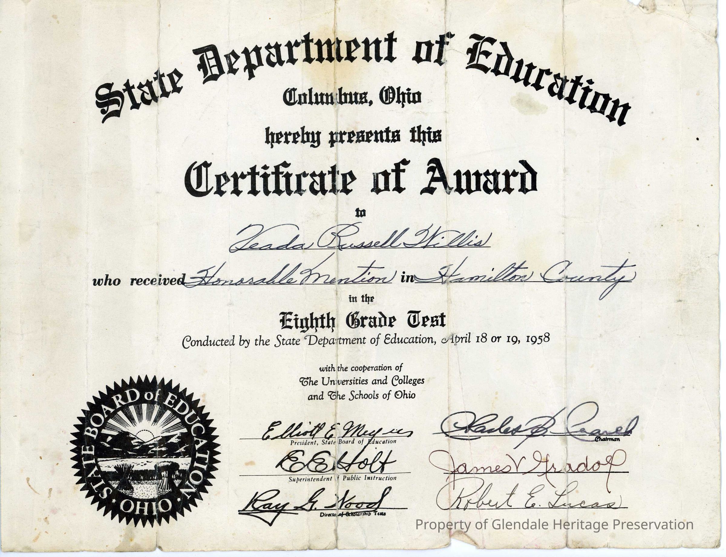 Certificate of Achievement presented to Veada Russell Willis by the State Department of Education in 1958Lexicon