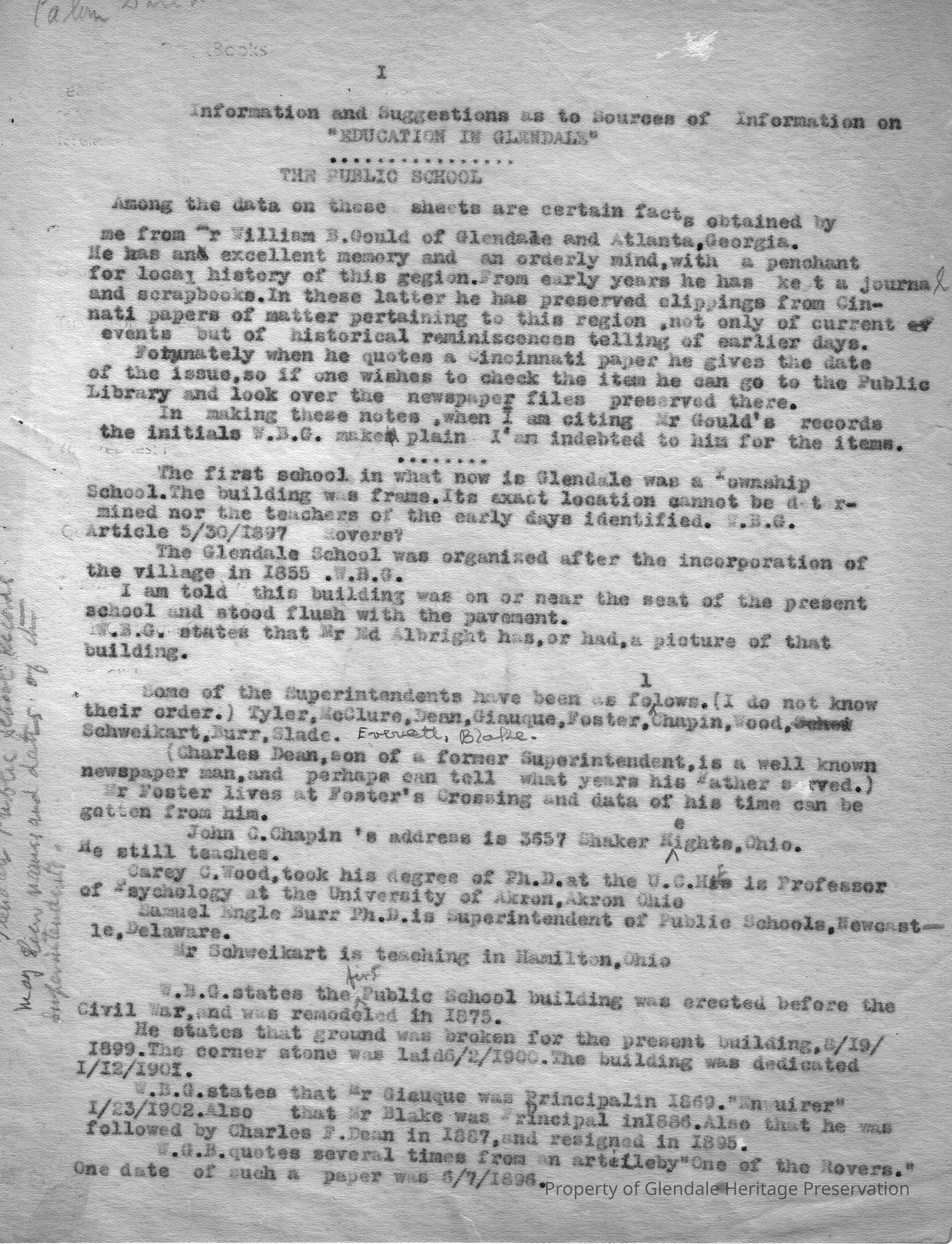 Author is possibly Calvin Dill Wilson. His name is penciled on the page. GHP does not seem to own this publication. A listing of the principals since the incorporation of the Glendale School is included.