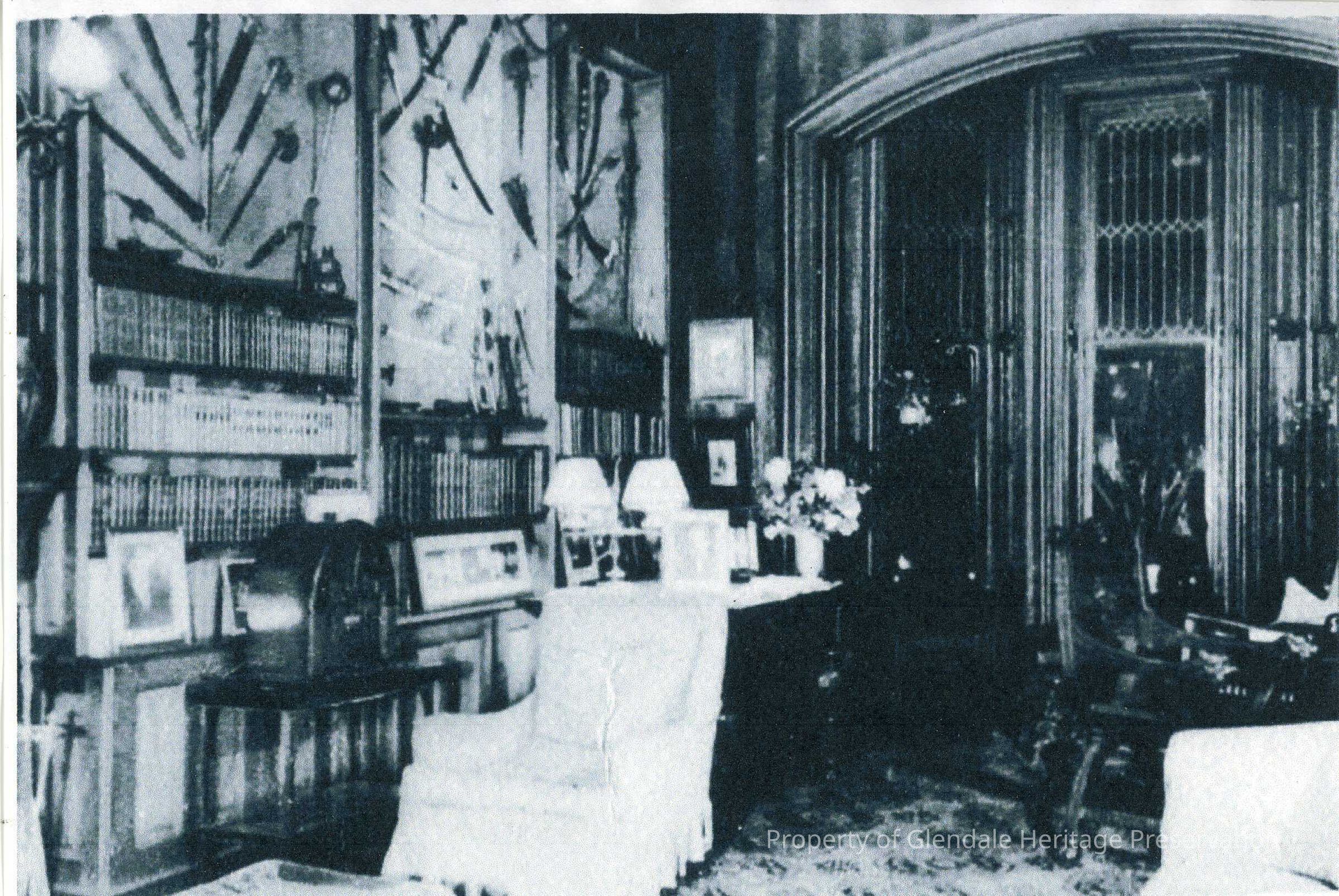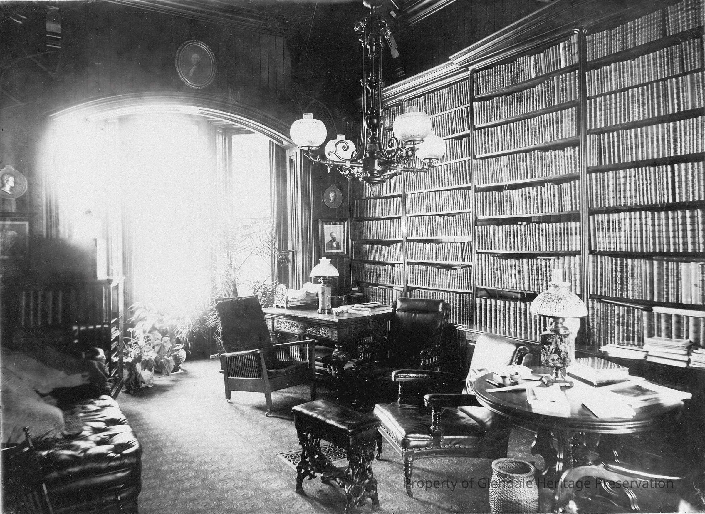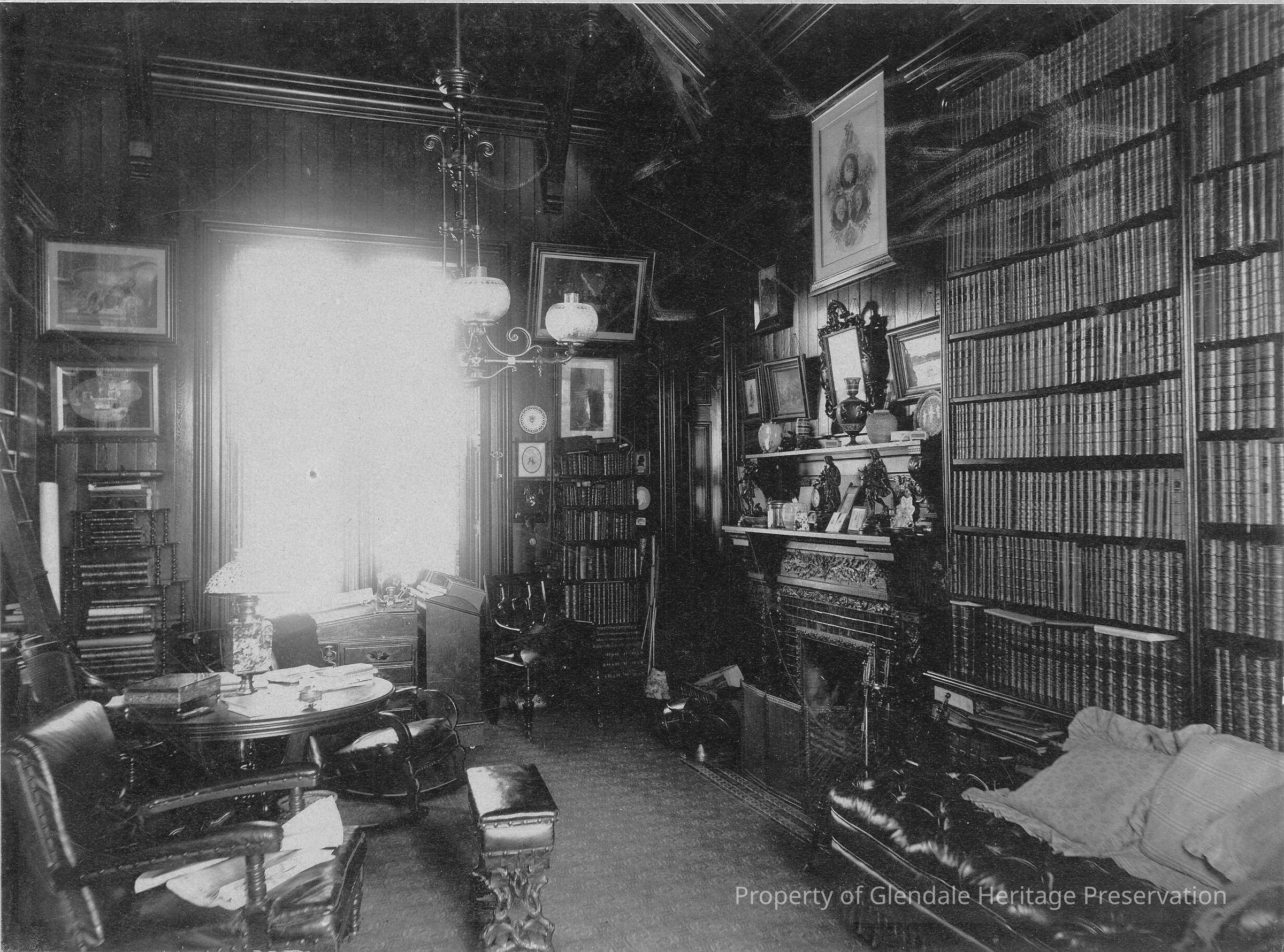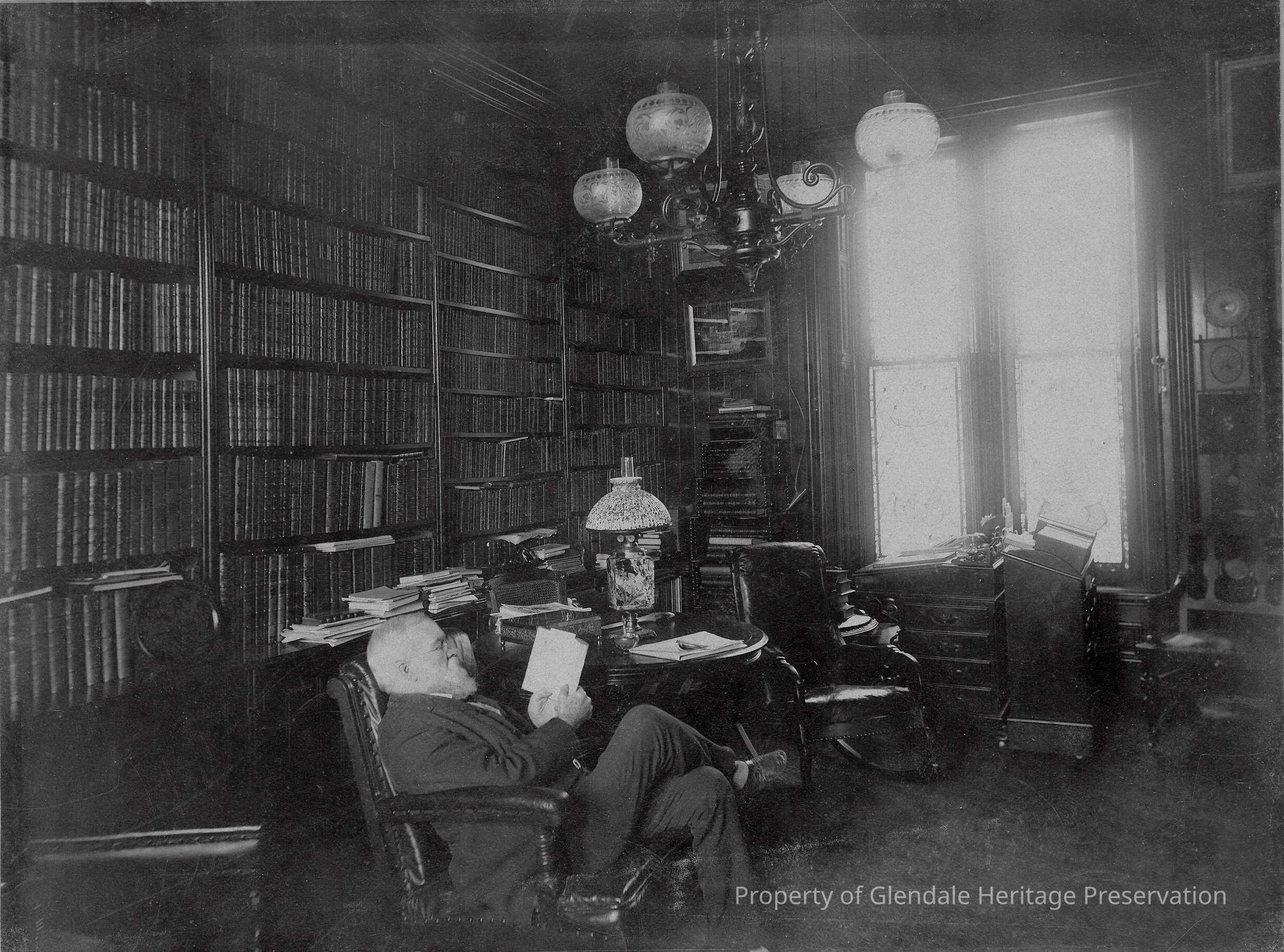 Pictures are attached of Mr. Clarke in his library which was specially constructed with double thick walls to protect his book collection. The collection contained over 6,000 volumes.