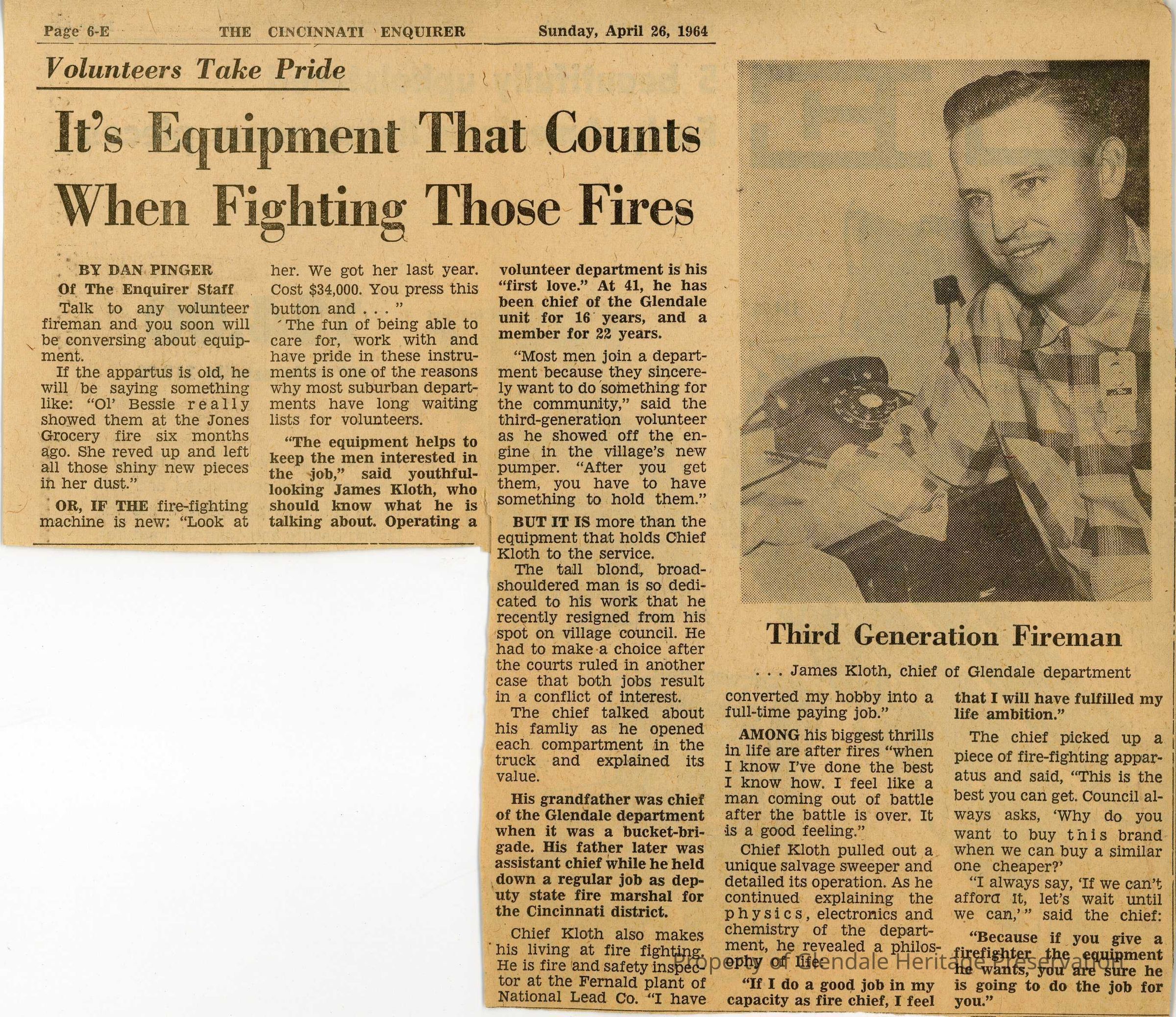 Article about James Kloth, Third Generation Fireman and a history of his family. His grandfather, father and four of his brothers were all fireman. His grandfather, Charles Kloth, was Glendale's first appointed Fire Chief.