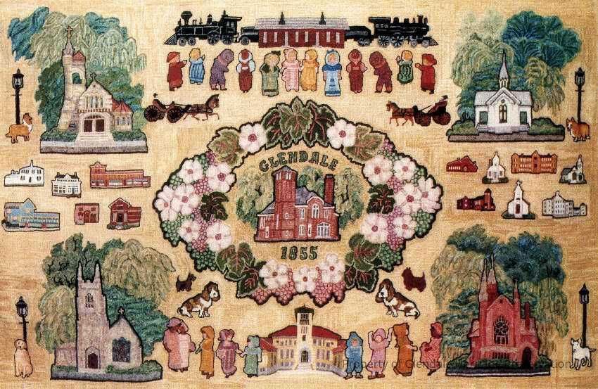 Hand hooked rug with hand dyed wool designed and hooked by Alberta Strauss. She began working on the rug in the 1980s when she lived on Ivy Avenue. The rug is on permanent loan to the Presbyterian Church.Relationships