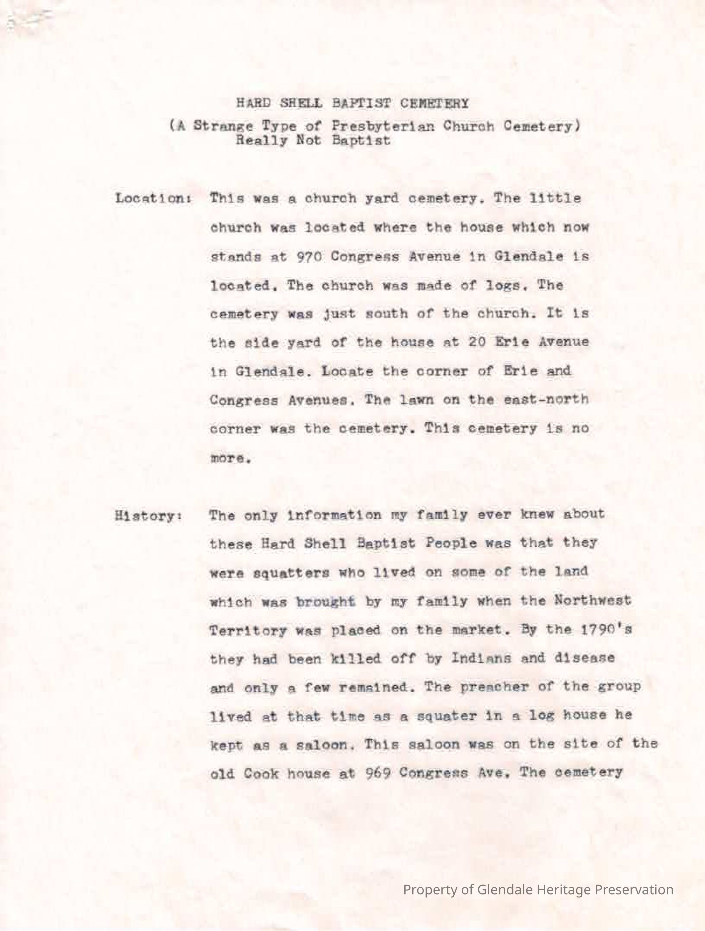 Set of documents by Bill James Cook regarding the Hard Shell Baptist Cemetery which is located on the side yard of 20 Erie Avenue.According to Mr. Cook most of the members had died by the 1790s. The preacher lived as a squatter in a log house which he kept as a saloon. This saloon was located at 969 CongressLexicon