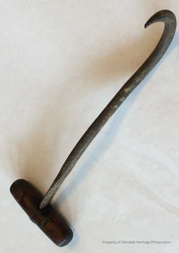 Hay bale hook. Used by John Riddle. Found at the C. H. Allen House, 780 Congress Ave.