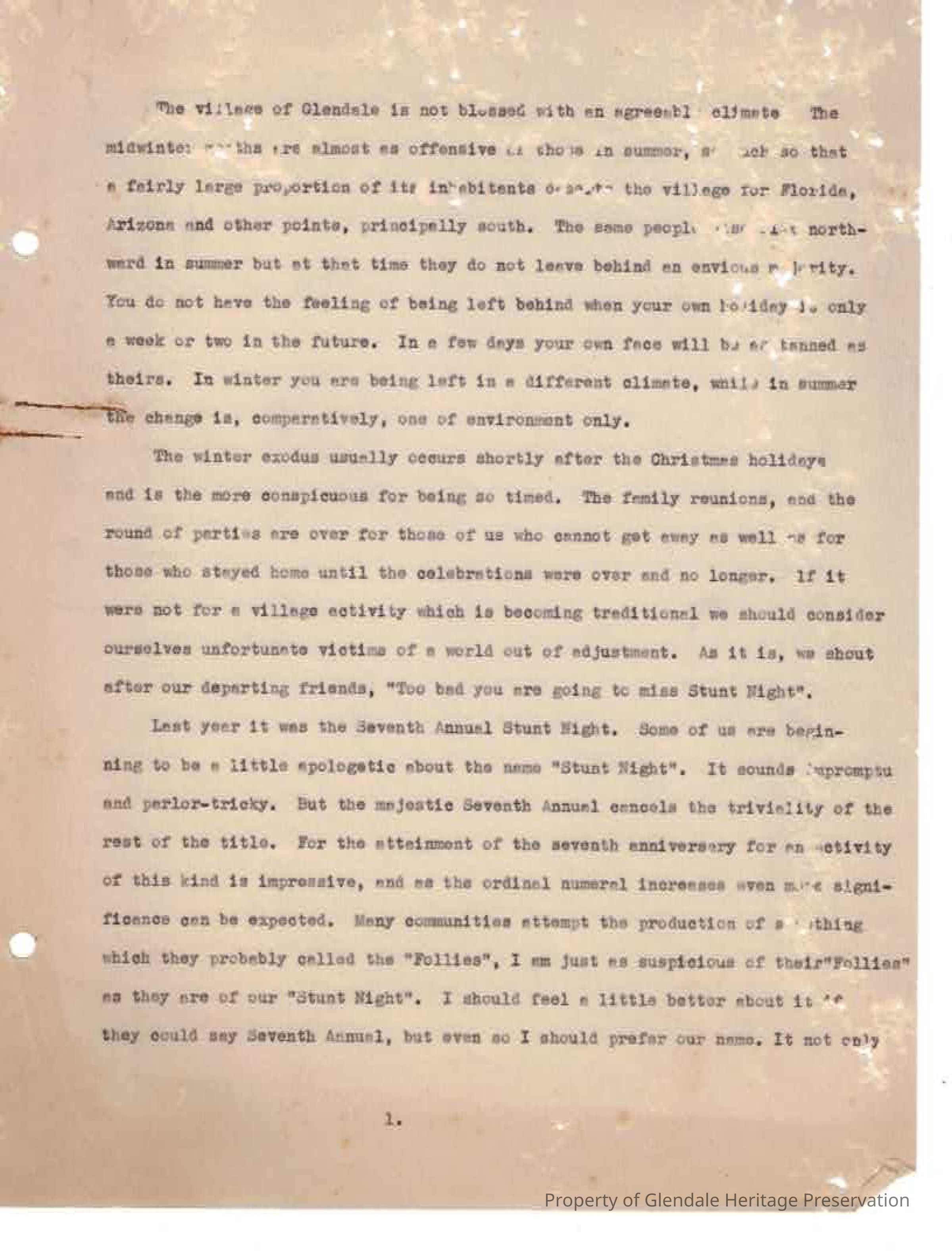 History of Glendale P.T. A, Stunt Night written by Archibald Dennison The paper is not dated but it was written the same year as the Eight Annual Stunt Night was held.Relationships