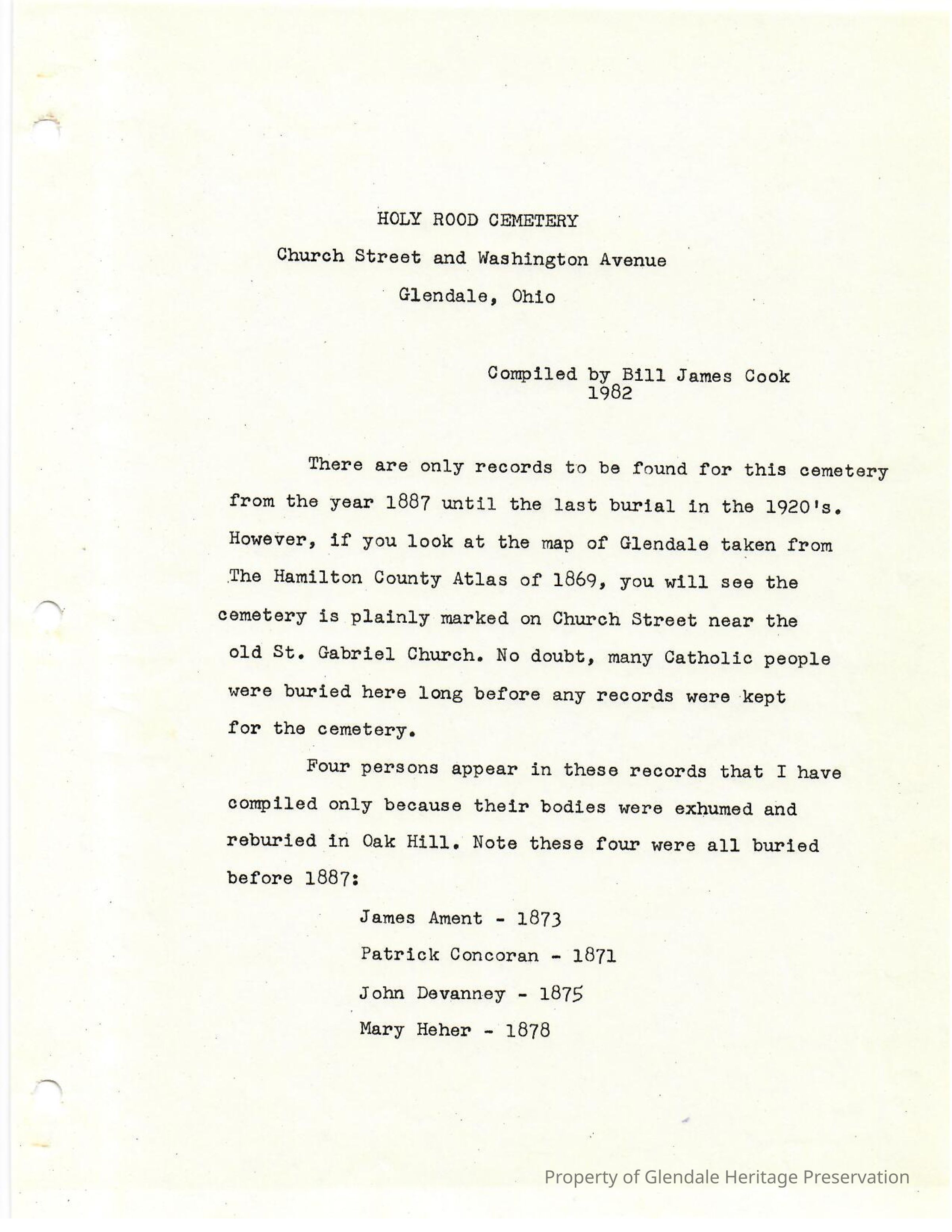 Set of documents by Bill James Cook regarding the Holy Rood Catholic Cemetery. This was the burying ground for the parish of St. Gabriel. Most of the remains were located to Oak Hill Cemetery beginning in the 1920s. Some remains were left buried. By 1982 only three stones remained: a large monument where the members of the Logan family were buried, a large stone with the name Costello and a tiny stone for an infant, Frances Dollman.
