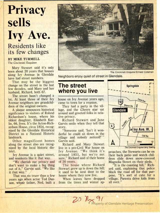 Description and history of some of the houses on Ivy Avenue. Dated 1991, Cincinnati Enquirer. Details about 820 Ivy and 785 Ivy. Mentions Gunny Hill sledding and visit of Ted Danson, TV show "Cheers".Lexicon