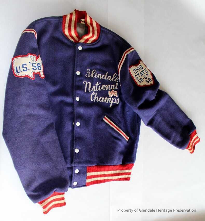Jacket worn by a member of the Glendale Baseball Team in 1958. Jacket is embroidered with the words "Glendale National Champs"Lexicon