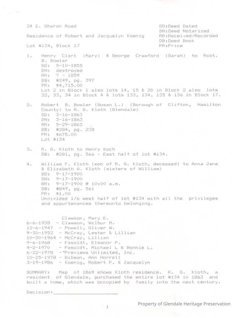 The house, located at 24 East Sharon Avenue, is a Contributing Structure.It was built in 1863. when the Kloth family purchased it.