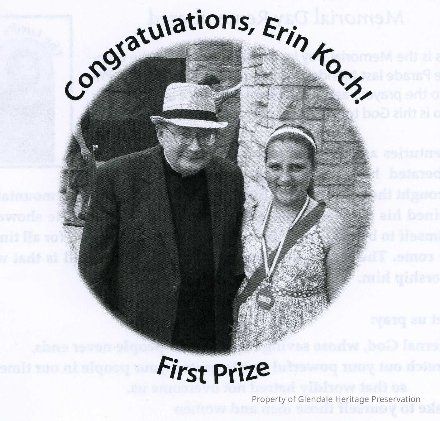 Collection of a newspaper clipping and copies of winning essay and prayers read at the Memorial Day Celebration, 2012. Includes a phoograph of Reverend David Fay and the contest winner, Erin Koch.Lexicon